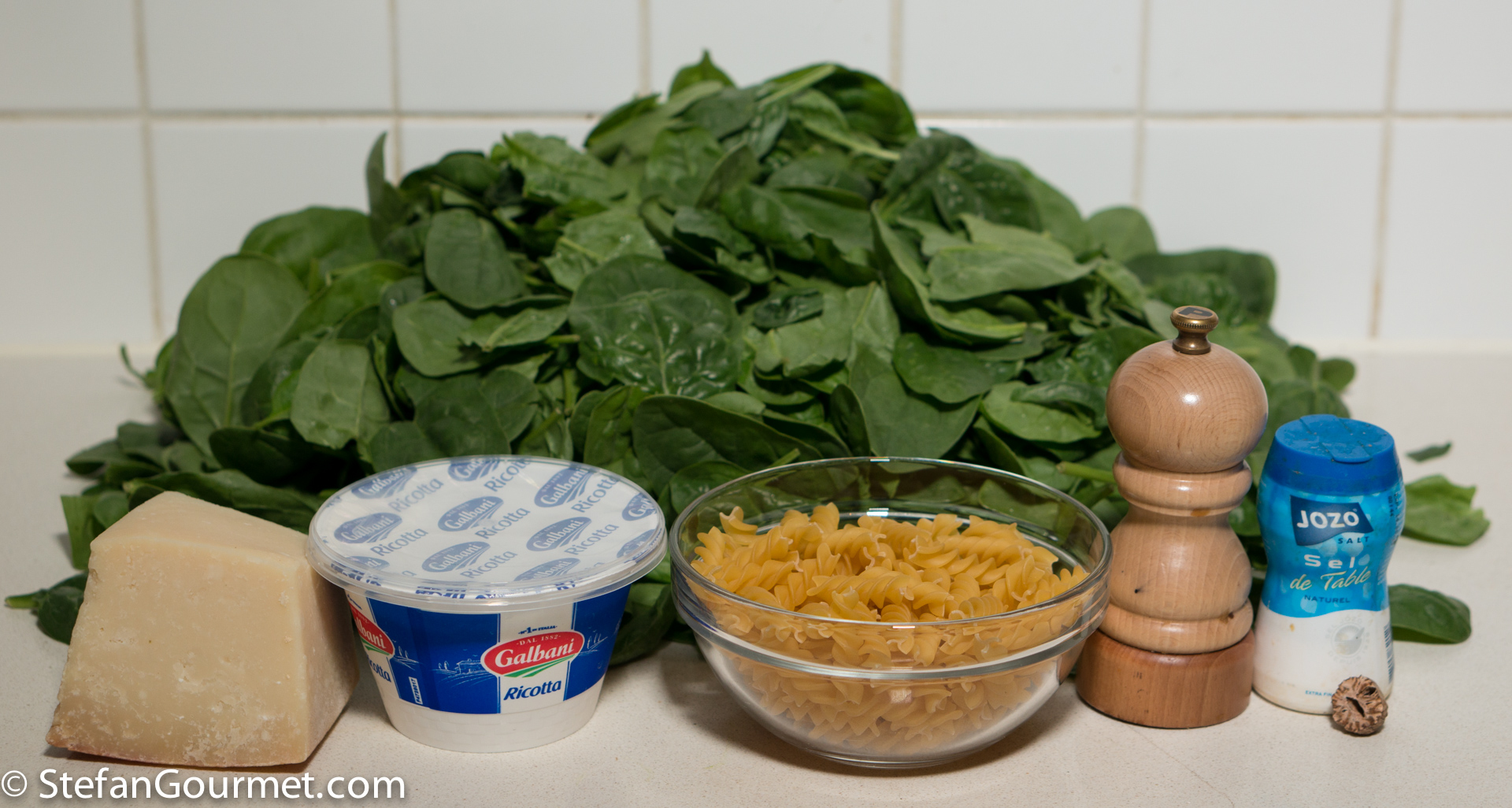 Ravioli filled with spinach and ricotta is a very popular Italian dish. But on a weekday after work there is no time to make ravioli. And so I prepare this quick and easy pasta with spinach and ricotta. Fusilli is a great pasta shape for this, as the spinach is ‘absorbed’ by the pasta very well. The mix of spinach, ricotta, and parmigiano with a dash of nutmeg works as well as in the ravioli. Making this dish takes only as long as it takes to boil the pasta.