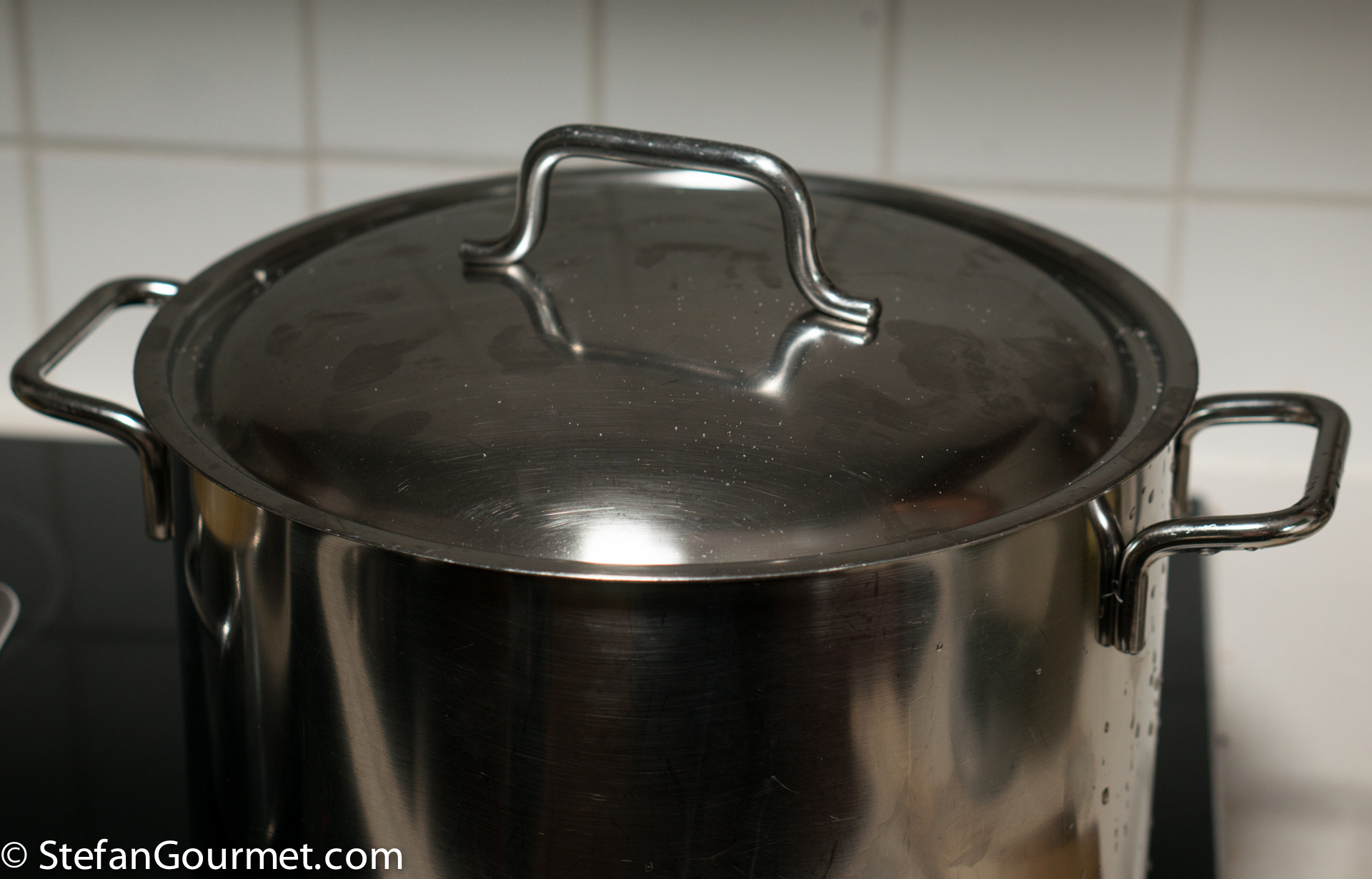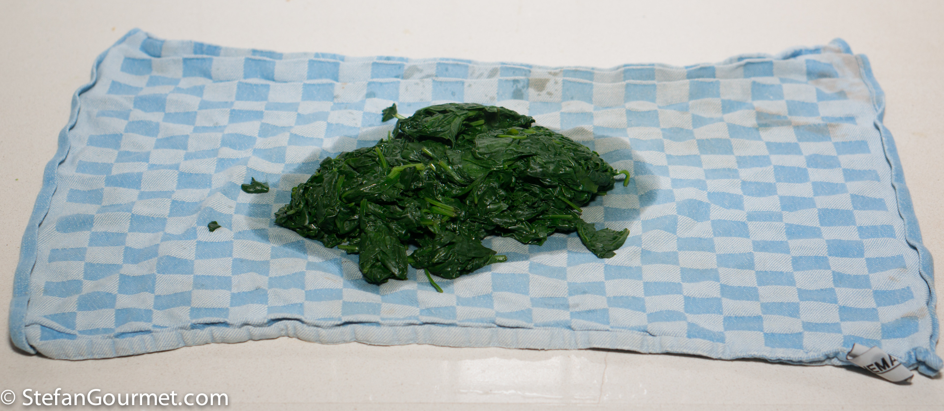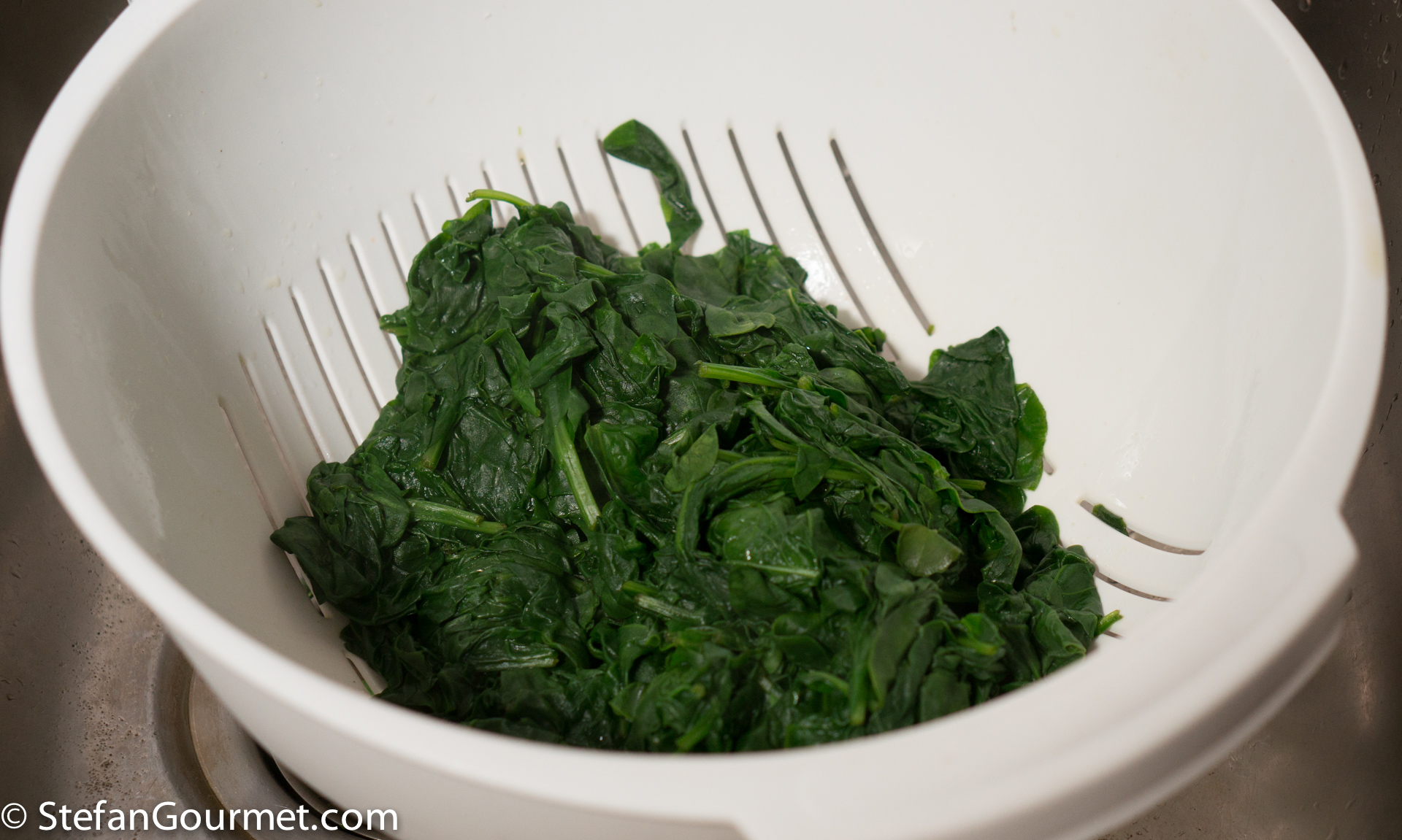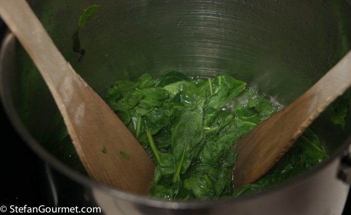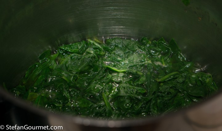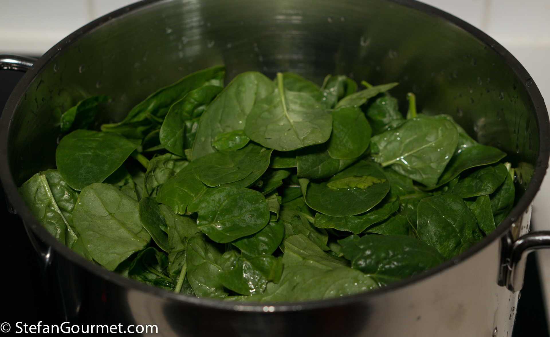 In the meantime, wash the spinach, and put it in a large pot (raw spinach requires a lot of space) with the water that still clings to the leaves from washing. (In Dutch we even have a word that is rarely used in another context: “aanhangend” water.)