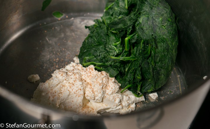 Combine the spinach with the ricotta and a dash of nutmeg in the pot that was used to cook the spinach. Put the pot over low heat.