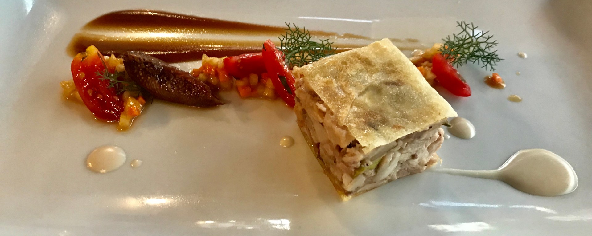 First antipasto: ‘terrine’ of maialino with all kinds of condiments including figs, and pane lentu. This wasn’t really a terrine as the morsels or maialino were not bound together. They were tender and succulent. The matching wine was chosen to cut through the fat of the maialino: a ‘natural wine’ of Vermentino and Semidano. The latter an obscure autoctonous grape variety. Natural wine can mean all kinds of things and in this case no use of sulphites and no filtering. The result wasn’t bad as natural wines go (can you tell I am not a fan) and quite high in acidity, but not a bad pairing.