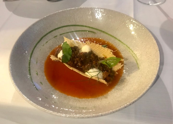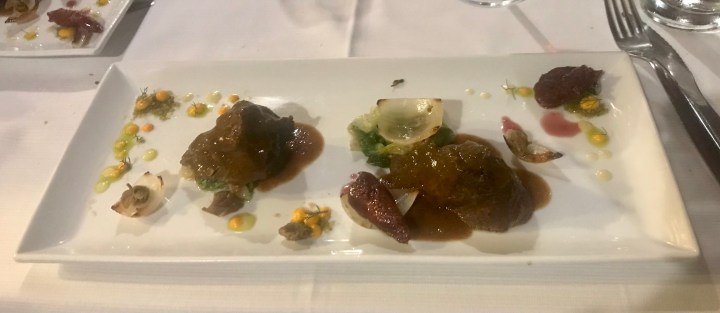 The primo was Filindeu, a very crunchy pasta that seemed to be woven of thin threads of dough. It was filled with a ‘knife chopped’ ragù of mutton that was very flavorful and tender, and served with a fresh tomato sauce with a great tomato flavor. This was matched with a Carignano del Sulcis, another natural wine. The acidity worked well with the tomato sauce, although a more fruity wine would also have worked very well. (Not using sulphites means losing the fruit flavors in the wine.)
