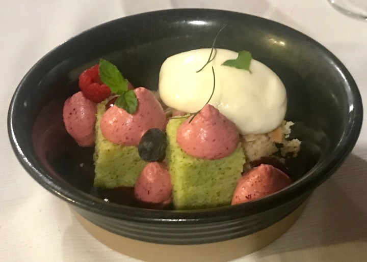 Dessert was soft zucchini cake with strawberry sorbet and Gioddu ice cream. Gioddu is fermented sheep’s milk from Sardegna. This was paired nicely with a sweet Malvasia.