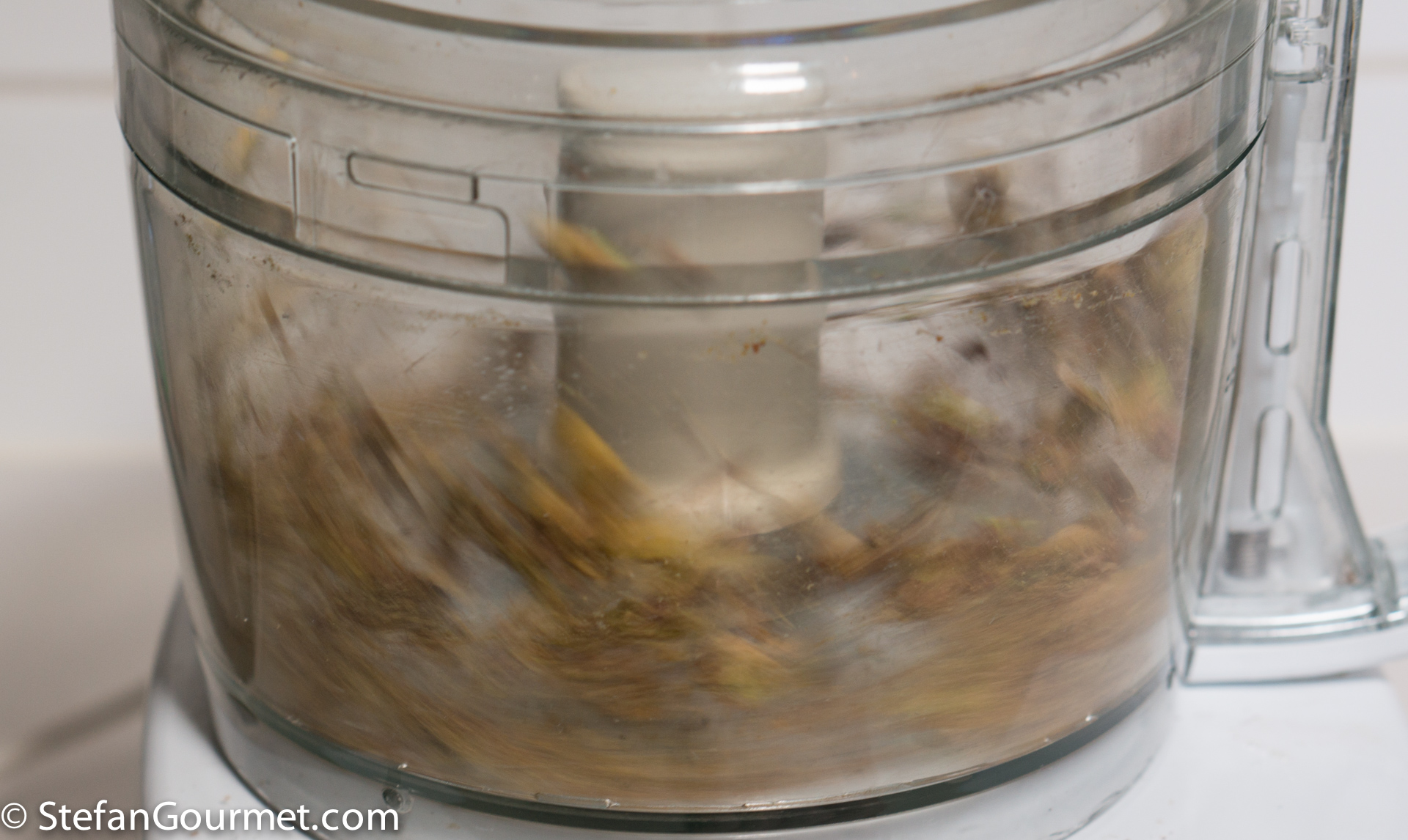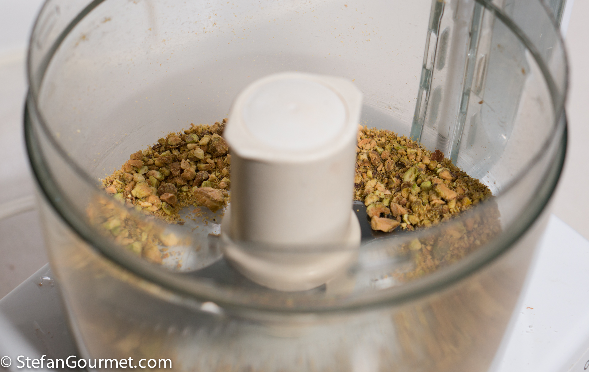 Toast the pistachios in the oven for 10 minutes at 180C/350F; this really brings out their flavor. Pulse in a food processor…