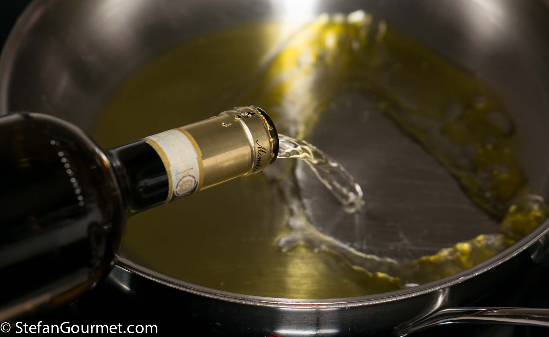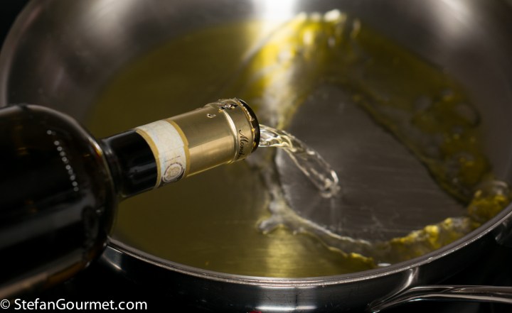 …and 250 ml of fish stock. Allow to reduce by about half over medium heat.