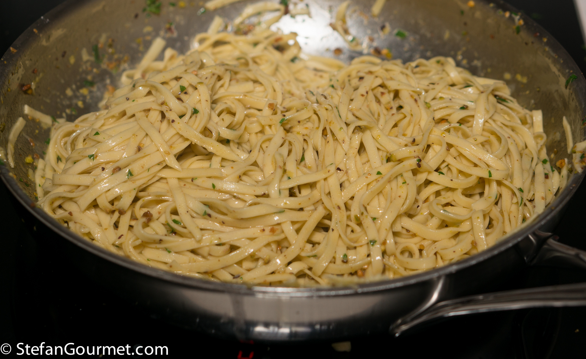 Bring a large pot of water to a boil for the pasta. Meanwhile, heat 2 tablespoons of olive oil in a frying pan. Peel the garlic clove and slice it thickly. Tilt the pan and cook the garlic in the oil over medium heat until golden, then discard the garlic. Using this technique, you infuse the oil with garlic flavor.