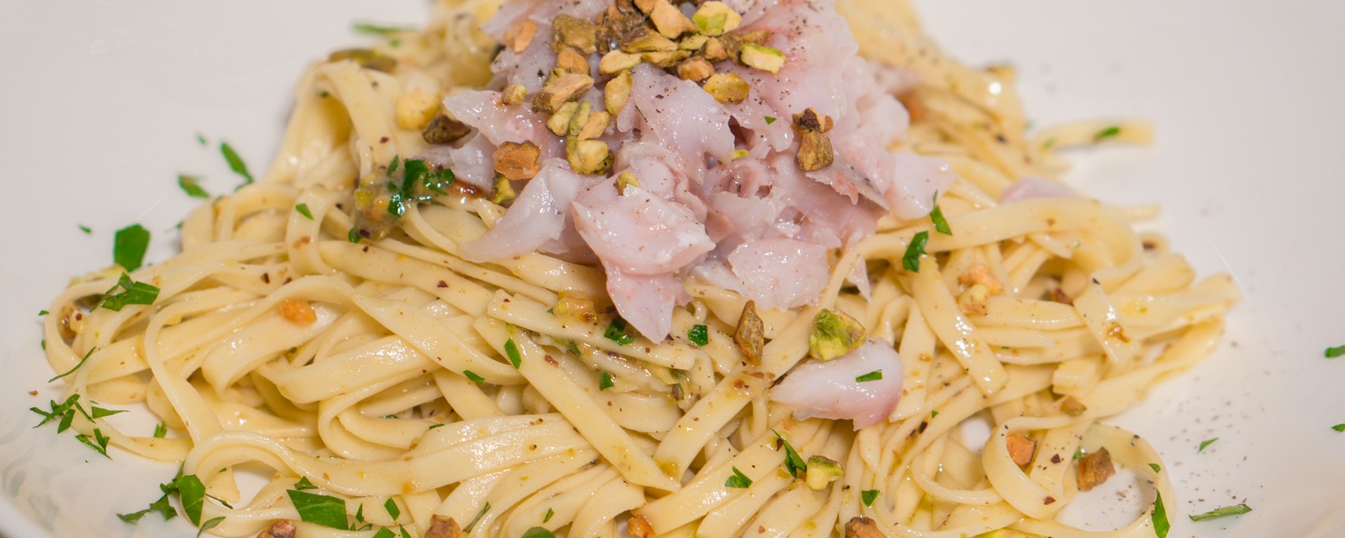 Serve the pasta on preheated plates. Top with the fish, chopped pistachios, and the remaining parsley. Drizzle with good extra virgin olive oil, and serve at once.