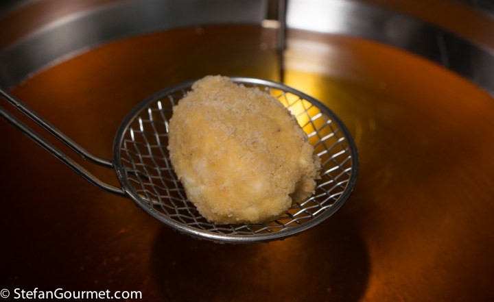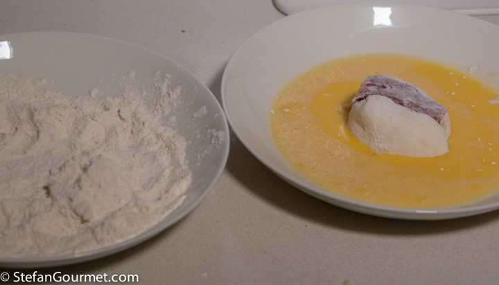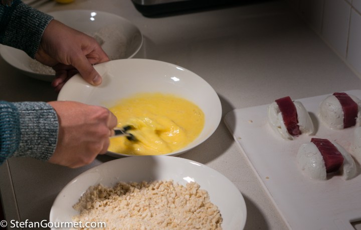 Take a mozzarella/tuna ‘ball’ and dust it with flour. Then dip it in the beaten egg and make sure it is coated on all sides.