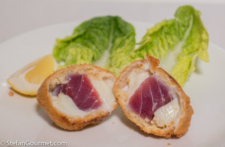 This appetizer was inspired by something we had at Taverna Estia** near Naples in Italy. Deep fried mozzarella is a common appetizer, but here it is enriched in two ways. First, by including tuna in the filling. Second, by using almonds for the crust. (At Estia a mixture of almonds and pistachios was used, and it was enriched even more by serving it with a Japanese ponzu sauce.) It is a bit finicky to put the breading on these. The combination of flavors and texture is very nice. Here’s what I did…