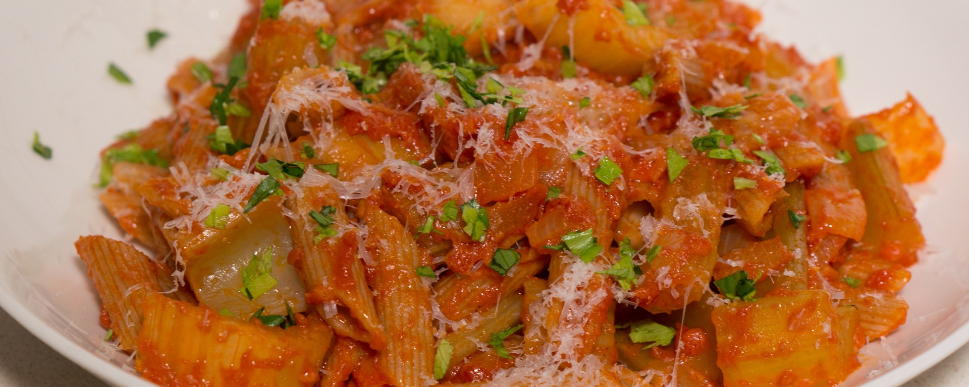 I prepared this dish a couple of months ago and neglected to blog about it. Although Stefano presented it as a summer dish, it is great for autumn as well. Celery is often used in Italian cooking together with onions and carrots, but in this dish it shines on its own. Celery is braised in a tomato sauce, and then served as a side dish on its own, or over pasta. I did the latter. Kees usually likes all the food I cook, but in this case (as I could have expected, because I know he hates celery) he refused to eat it. But if you like celery, this is really nice. The celery needs to be braised until it is tender, which can take quite a while. The reason for that is that the acidity of the tomatoes actually keeps the celery firm. For a shorter cooking time, you could first blanch the celery in water with a bit of baking soda. Baking soda is alkaline and has the opposite effect of acid on cooking the celery.