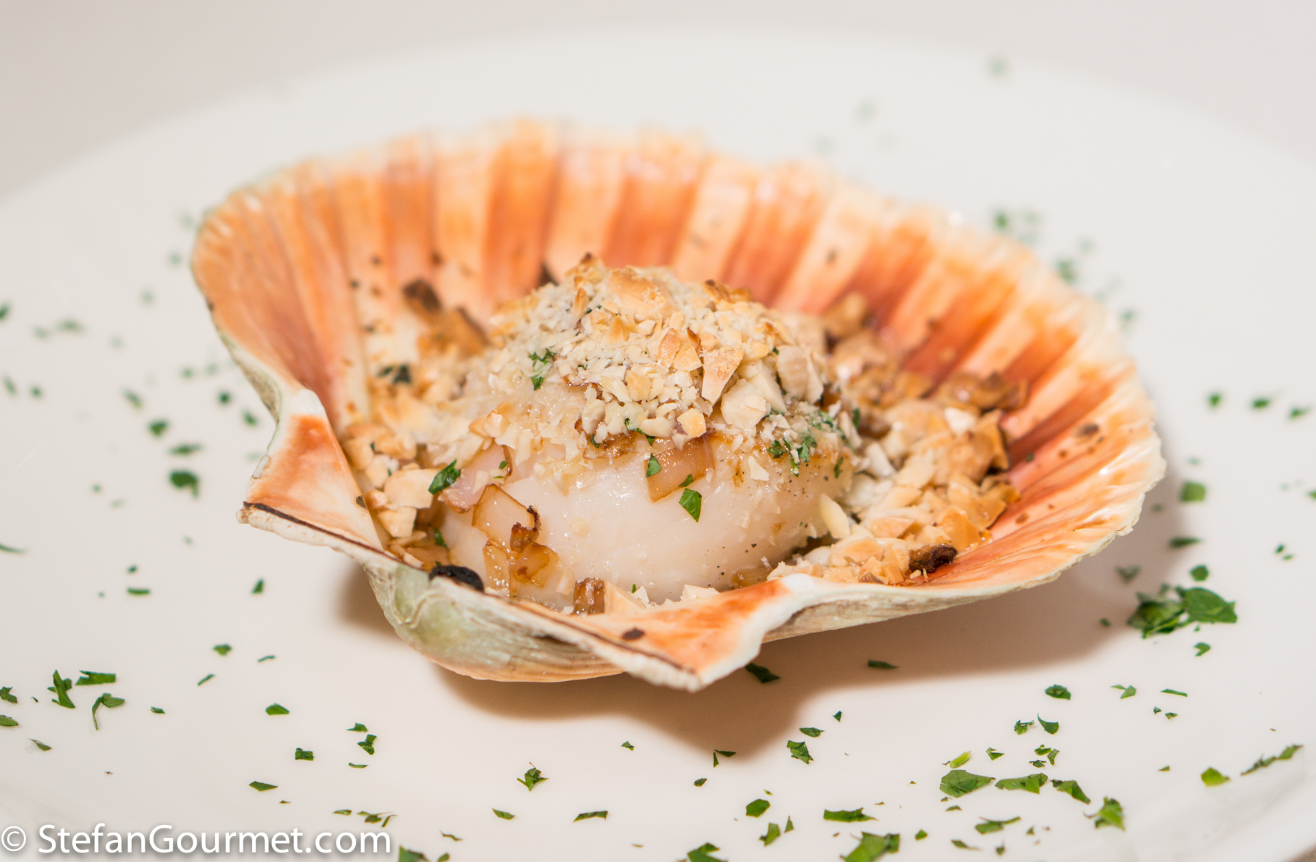 Scallops gratin with almonds is a great looking and great tasting appetizer, very suitable for a dinner party with great effect for relatively little effort. The sweet creamy shallots work wonderfully with the crispy nutty almonds and meaty slightly sweet scallop. You can prepare it in advance and just pop it in the oven for 10 minutes before serving.
