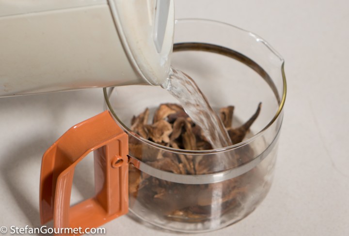 Put the dried porcini mushrooms in a bowl and cover with boiling water. Allow to soak for 10 minutes.