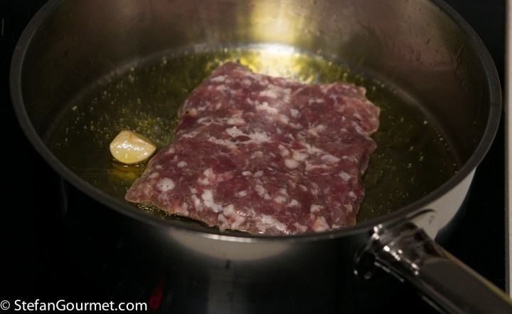 Add the sausage meat and discard the garlic clove.
