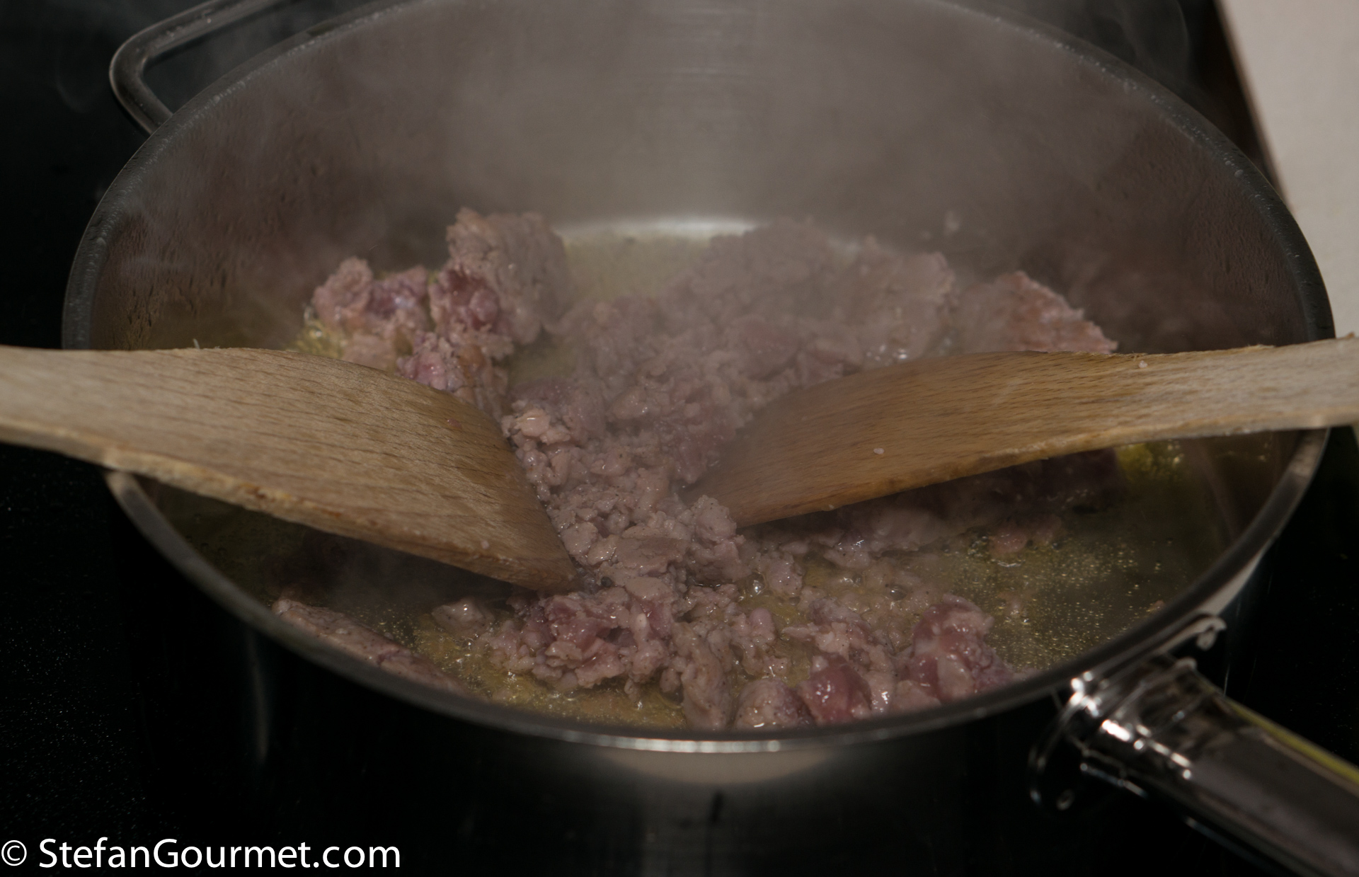 Cook the sausage meat over medium-high heat, breaking it up with wooden spatulas…