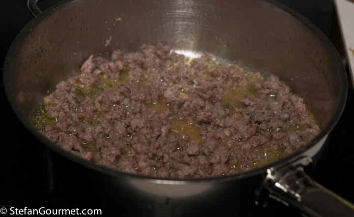 250 grams (8 oz) sweet Italian sausage, taken out of its casing (I make my own Italian sausage and don’t bother to put it into casings as the first thing I am going to do is take it out of the casing)