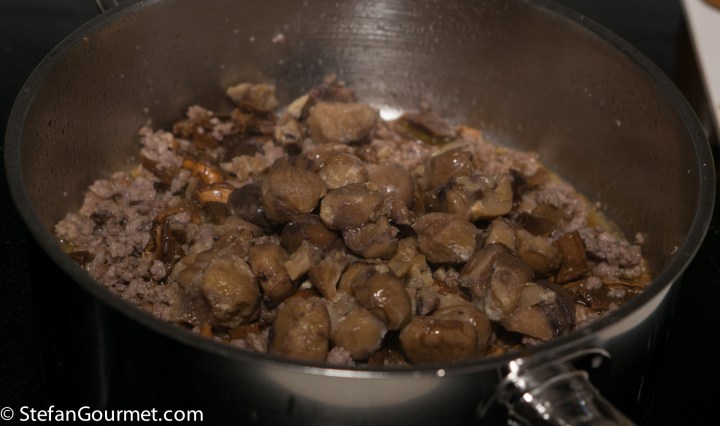 Sometimes I see an interesting ingredient at the market that is interesting mostly because I don’t use it often, and then I buy it and it ends up going past the expiry date because I don’t use it often. Sounds familiar? I had some already cooked chestnuts that were going down that path, and so it was a good thing that I saw a recipe for pasta with chestnuts and sausage on Paola’s blog Primo non sprecare. It is very appropriate to use one of Paola’s recipes to avoid throwing away food, because that is exactly the theme of her blog.