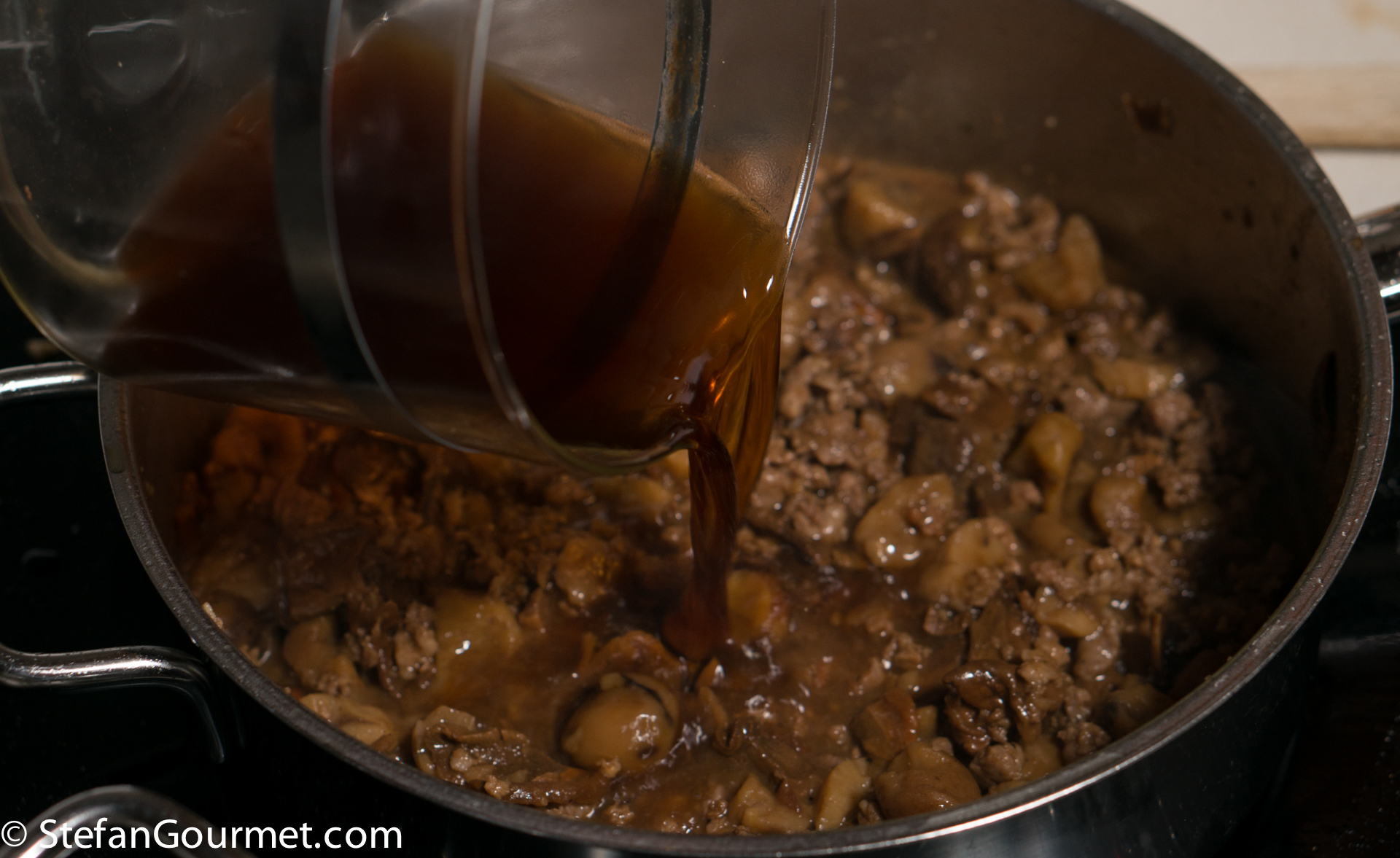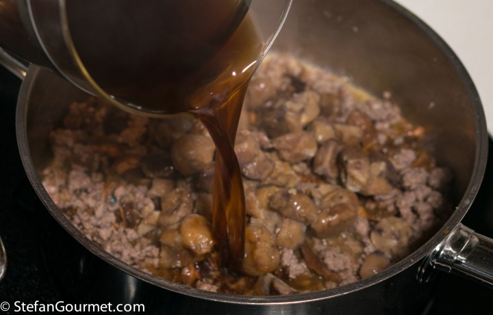 Take the mushrooms out of the soaking liquid and reserve. Filter the mushroom soaking liquid through a paper towel.