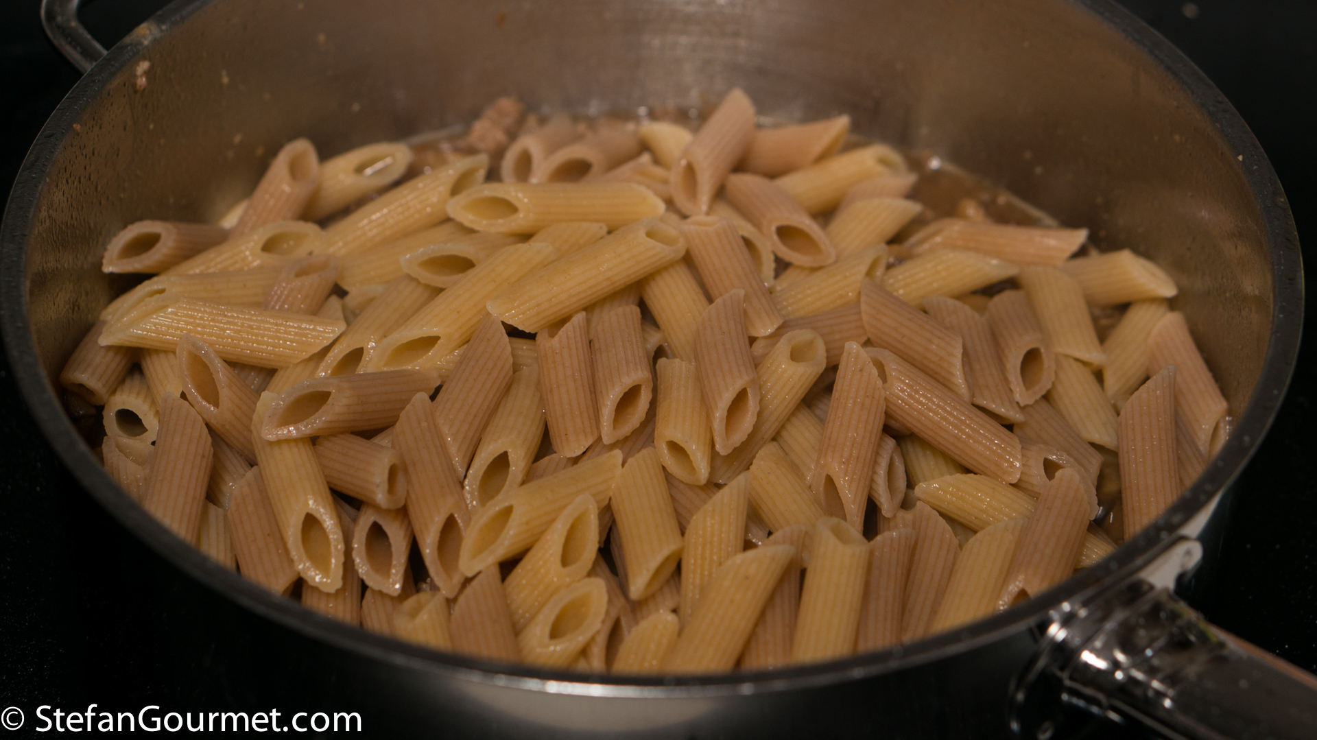 Drain the pasta about 1 minute before it is al dente and then add the pasta to the sauce.