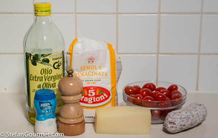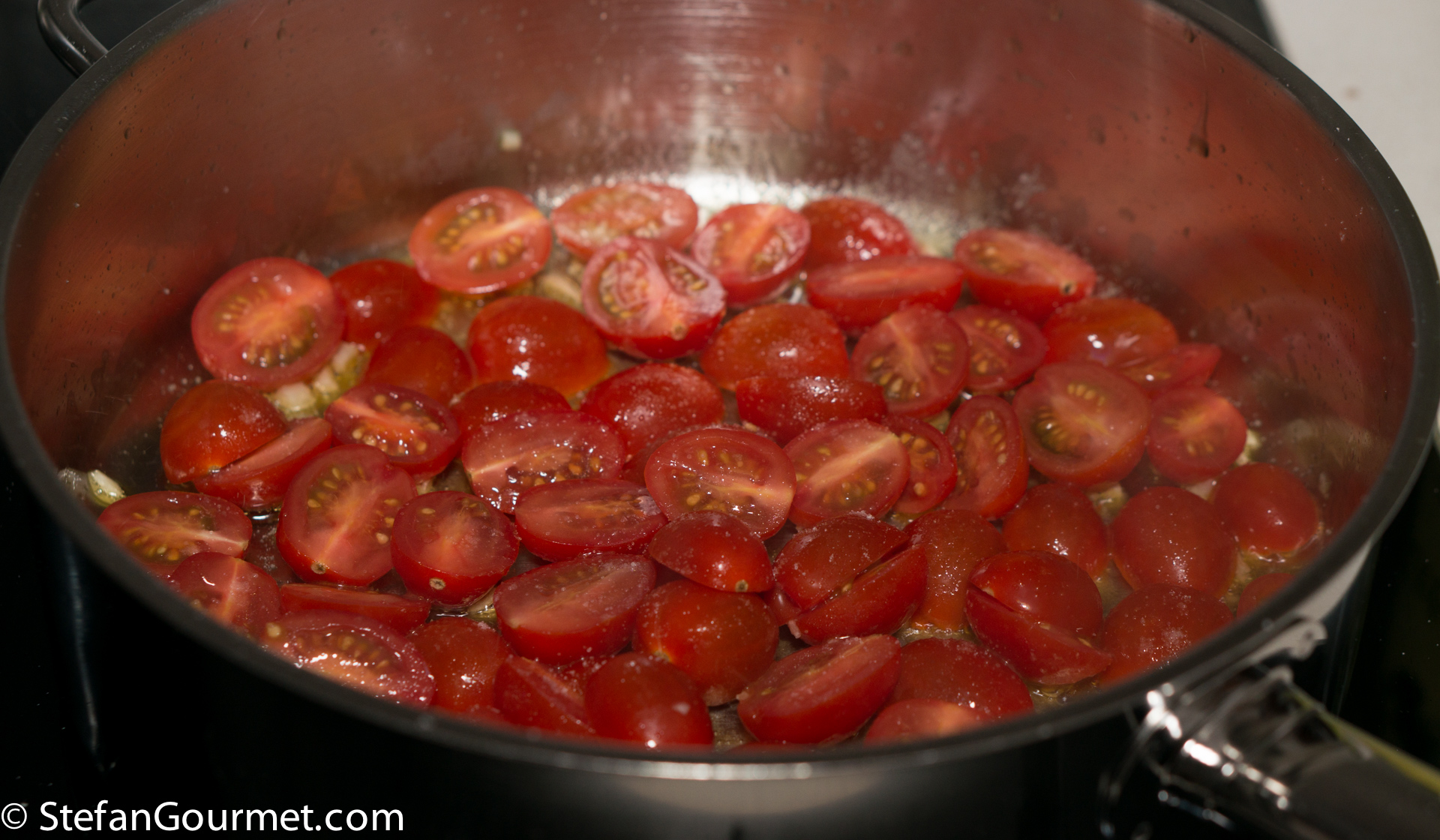 Once the pasta is made (or if you use store-bought pasta), this dish is very quick. The only tricky part is the timing. I started a bit too early with the sauce and so my cherry tomatoes were a bit too soft by the time the pasta was cooked.