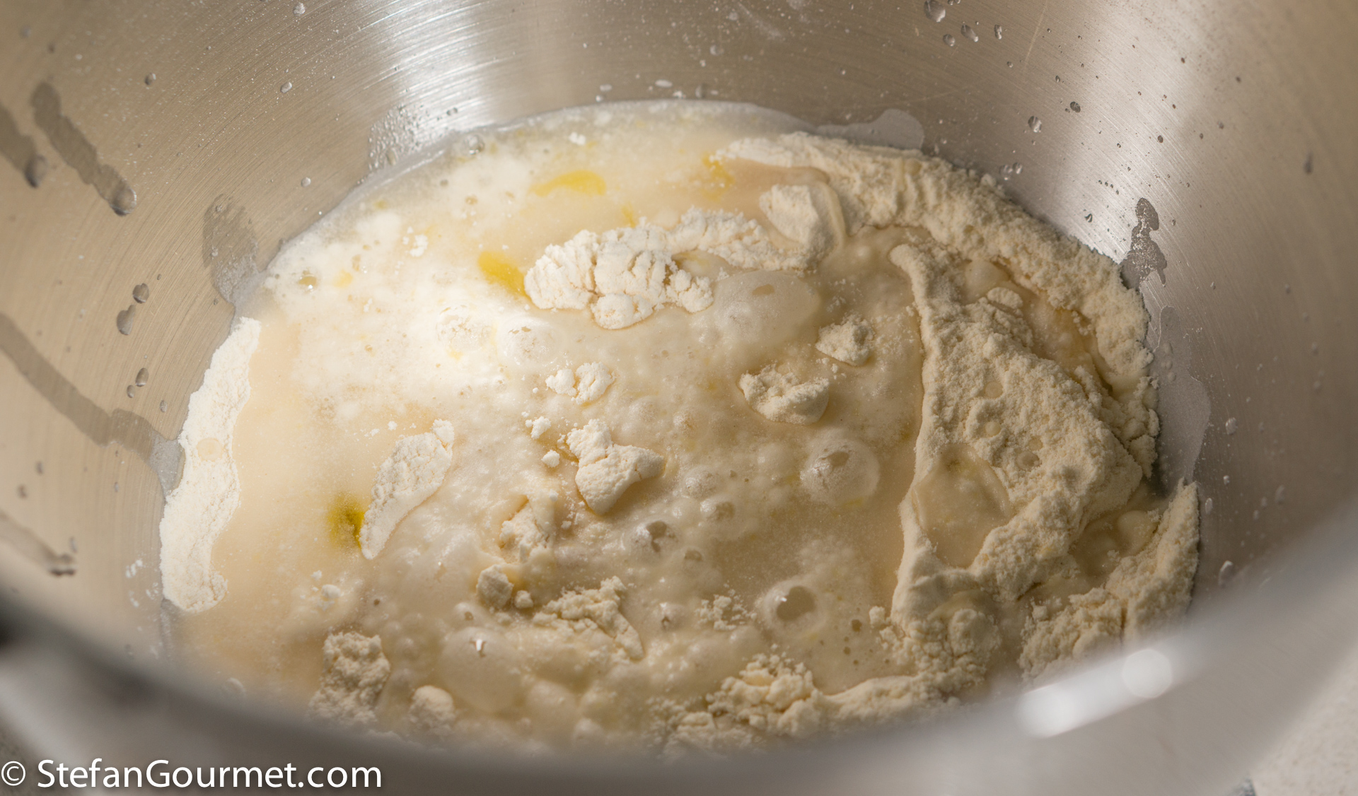 Put the flour in the bowl of the stand mixer together with 2/3 cup water, a tablespoon of olive oil, and 1/4 teaspoon salt.