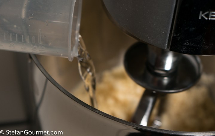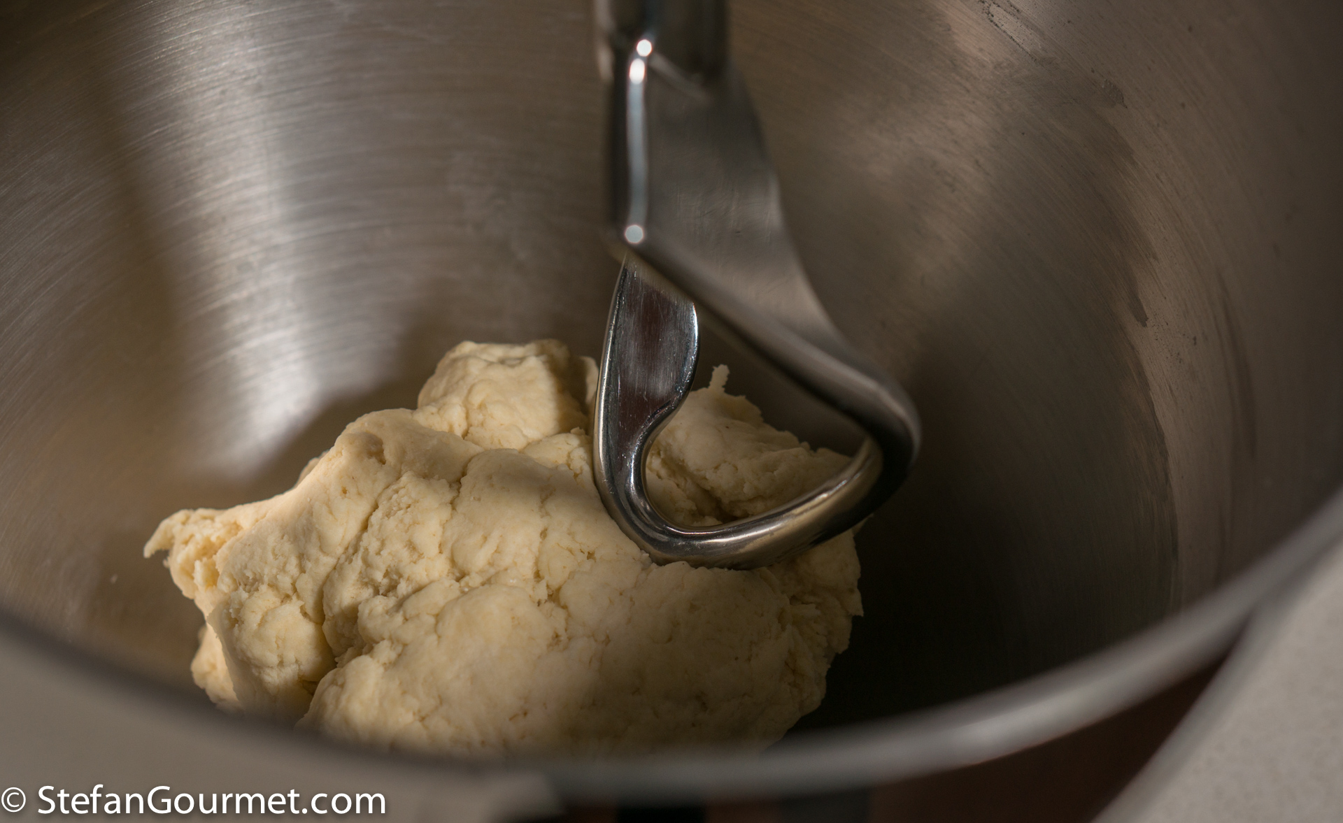 Mix with the paddle attachment until the dough comes together. Slowly add a bit more water if needed.