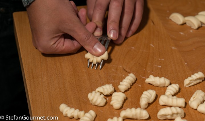 Take a piece of dough, roll it into a sausage as thick as your finger, and cut it into dumplings. Then roll each dumpling on the tines of a fork with your thumb.