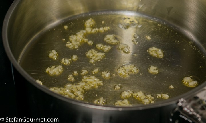 Heat 2 tablespoons of olive oil in a frying pan. Add the minced garlic.