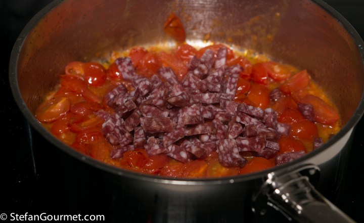 100 grams (3.5 oz) salame (dry sausage, not spicy), diced