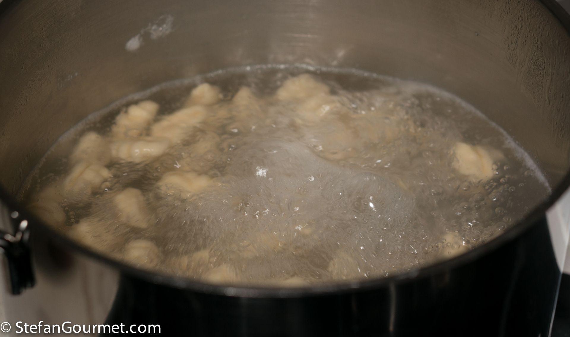 Bring a pot of water to a boil. Add salt and the dumplings. Boil them until they are al dente, about 8 minutes. The cooking time will depend on how large you made them and how dry they are, so you should taste to confirm they are done the way you like it and you should probably start tasting after 6 minutes.
