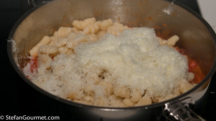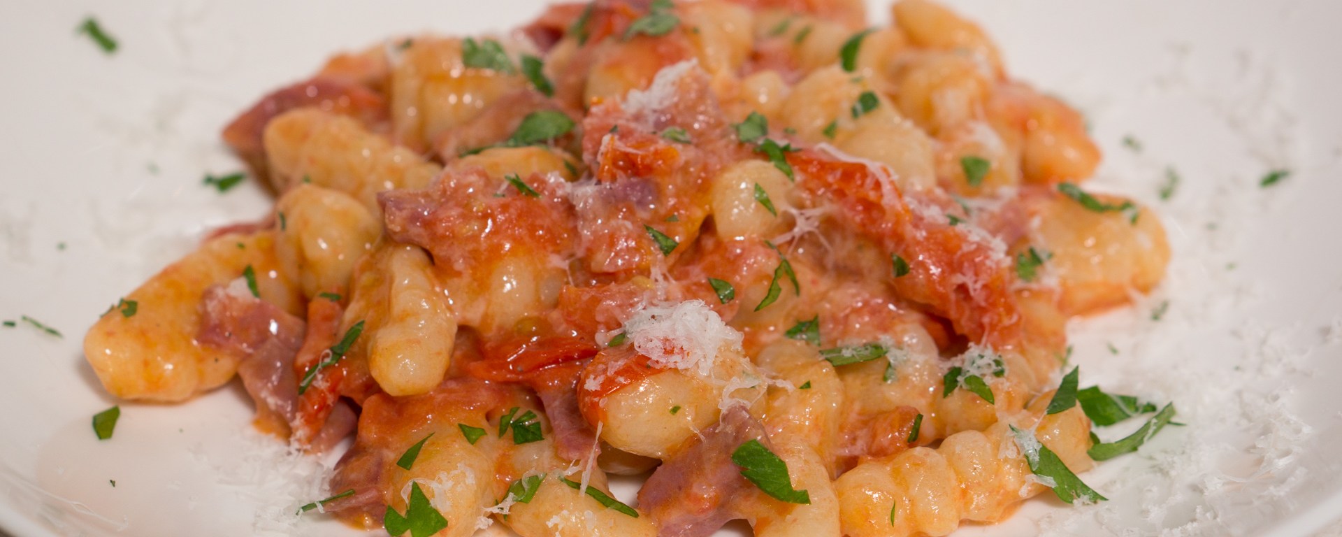 In La Maddalena we had a wonderful dinner at The Bistrot, a trattoria that prides itself on using ingredients from local artisan producers. La Maddalena is the capital town of the Maddalena archipelago on the North-East of Sardinia and the trattoria is a bit outside of the center. The menu changes daily based on what’s available and is written on blackboards above the kitchen counter. As primo piatto we enjoyed Fiores alla Gallurese. The pasta was dressed with cherry tomatoes, pecorino cheese, and dried sausage (salame). Fiores is the name of a pasta in the shape of a flower from a local producer. Since those would be too difficult to shape by hand, I decided to make chiusoni instead. These fresh pasta dumplings can be found all over Sardegna and are also called malloreddus or gnocchetti sardi. Alla Gallurese refers to the region of Sardinia, which is called Gallura. This is tasty way to dress pasta that for a quick meal you could also use with store-bought short pasta such as penne.