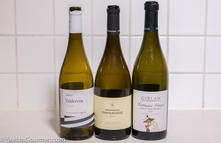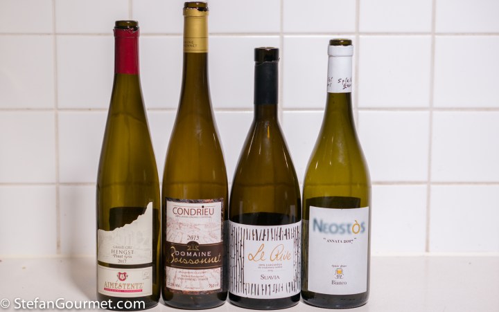 The pinot gris has marked residual sugar and although it did work with the dish, I thought it was too sweet. The other three wines are (nearly) completely dry, and despite the sweet elements in the dish they all worked very well with it.The Condrieu has developed a nutty buttery character because of the age (4 years is already quite old for Condrieu) and worked wonders with the dish. Yet another Pecorello from Calabria, which is very different from the other two because it is made in an oxidative style. This gives the wine a nutty character that works very well with the dish. Like the Capitel Croce, Le Rive is a Soave that is made outside of the appellation. The grapes are overripe so the wine has low acidity and because the wine is aged in barriques it has a nutty character, which worked very well with the dish.