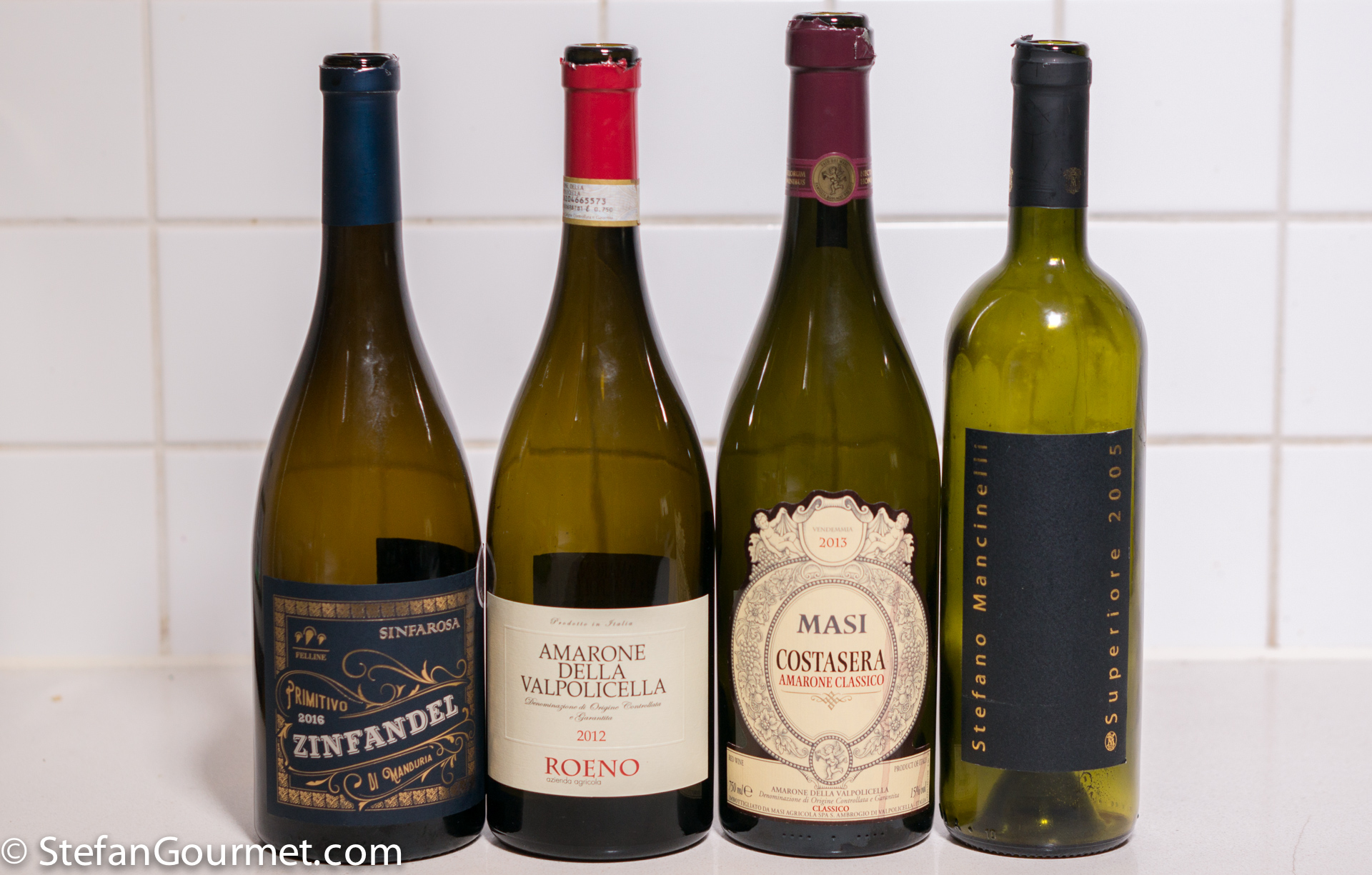 Because some Amarone can smell of chocolate, I thought that would be a good choice. However, the tannins in the first Amarone I tried, the Roeno, were accentuated by the astringency of the mole. Although it wasn’t bad, it was not as good as I had hoped. But I didn’t give up and tried again with the Masi. It has smoother tannins and was indeed a very good pairing with the mole. The Primitivo/Zinfandel was very easy. This grape variety has high sugar in the grapes, and thus high alcohol (15% in this case) and perhaps some residual sugar. I think Zinfandel from Lodi would also work very well with mole. Finally I decided to try a very rare wine, one of the last remaining bottles from my first wine buying trip to Italy in 2008. This Lacrima di Morro d’Alba is made in the Marche (known for its Verdicchio dei Castelli di Jesi) from a rare aromatic variety that smells of roses. In its youth the wine has marked tannins, but since this bottle was from 2005 I expected the tannins to be smooth. And indeed they were. Although this wine was not as full-bodied as the Amarones or Primitivo, because of the aromatic character it did work very well with the dish.