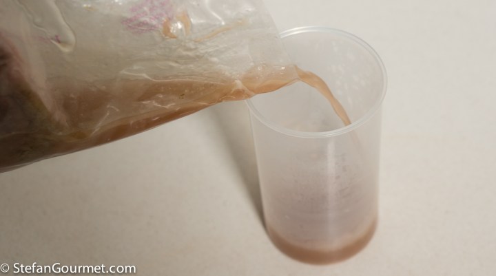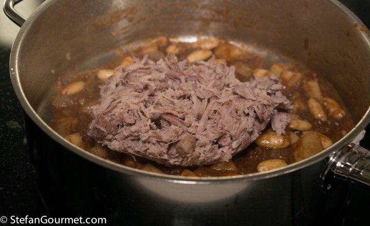 Pull the pork apart with two forks. If you allow the container with juices to cool, the fat that floats on top will solidify and you can use it for the filling.