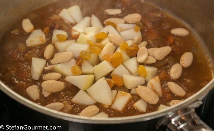 Because of the fruit elements and the astringent walnut sauce this is a tricky dish to pair a wine. An aged white wine that is creamy and has developed notes of almonds is a good choice. One of my favorite pairings is an aged Condrieu, made from Viognier grapes.