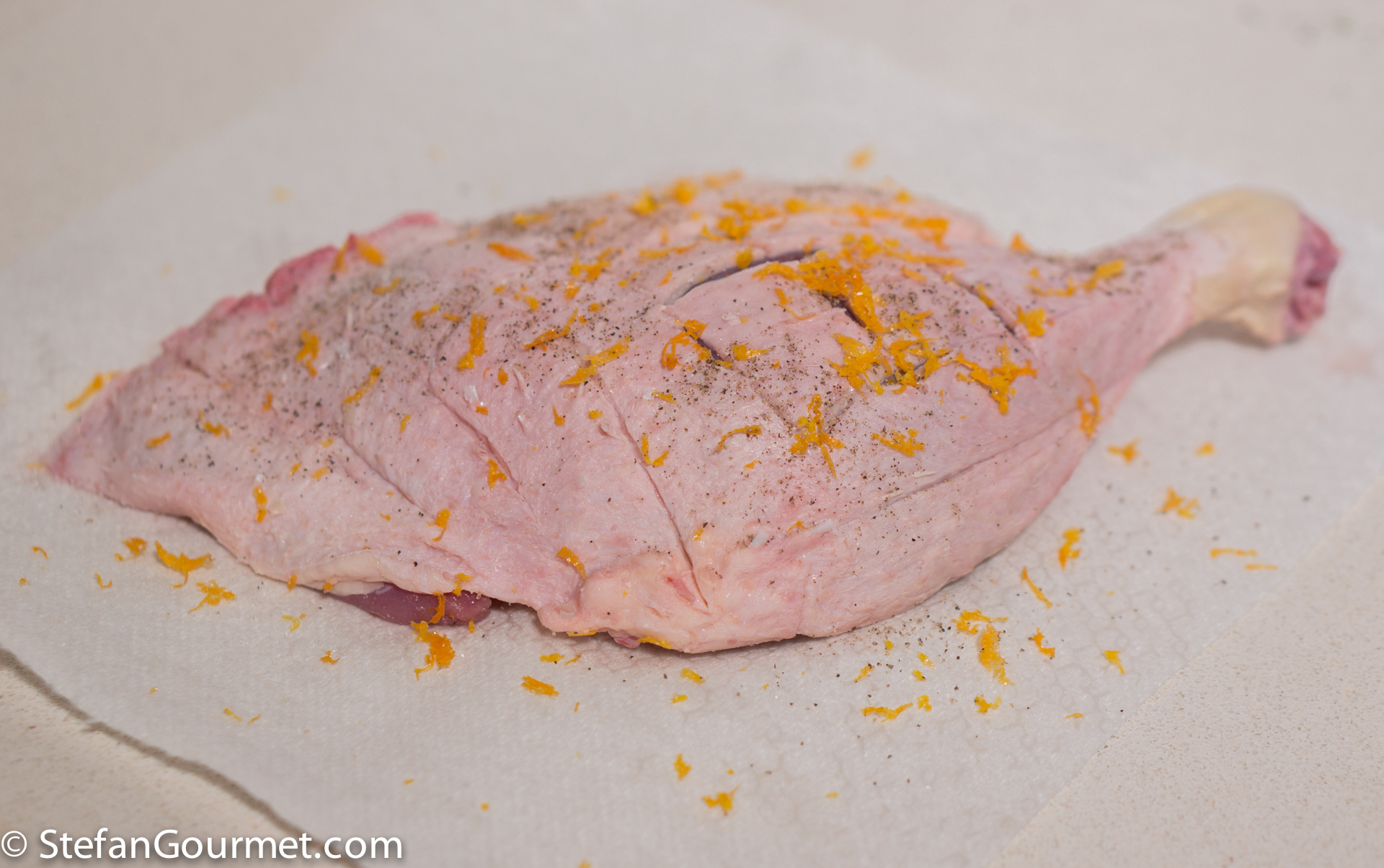 Score the skin of the duck with a diamond pattern. Season the duck with salt and freshly ground black pepper on both sides…