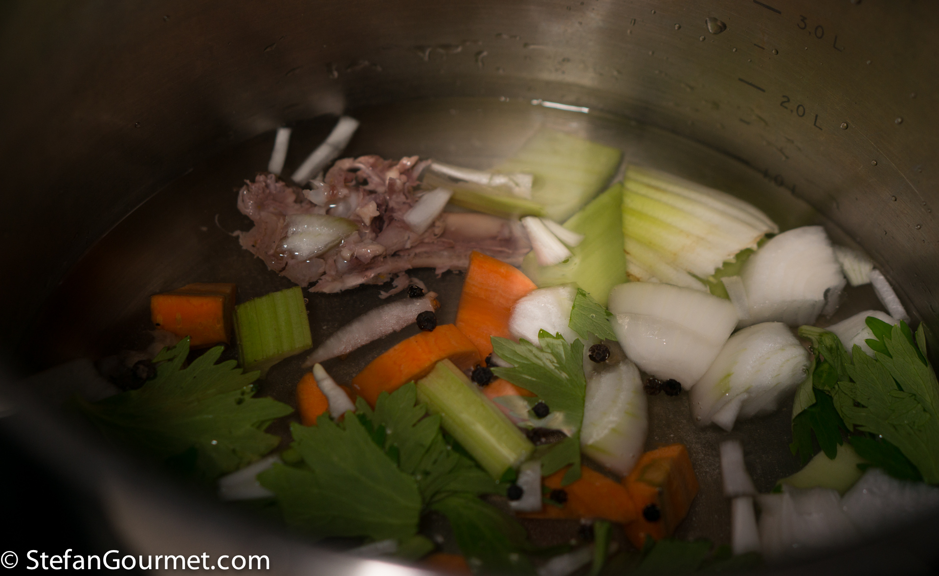 Put the duck bones in a stock pot or pressure cooker with celery, onion, carrot, and black pepper corns. Cover with water.