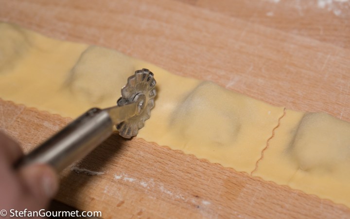 You can make the ravioli in any shape that I like. I like to just fold the dough over the filling and cut the ravioli on three sides, as that is the fastest way I know. But you could also use a round cookie cutter to make half moon shaped ravioli (mezzalune) or squares to make tortelli.