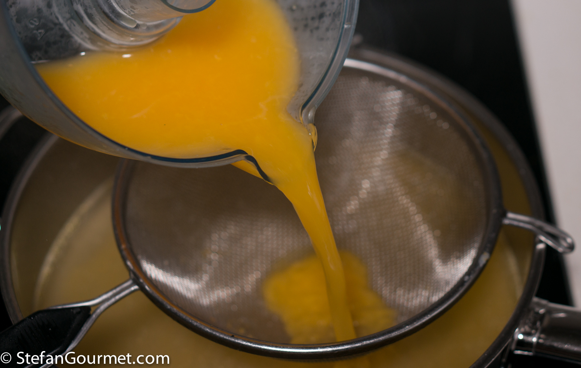 Add the sifted orange juice to the duck stock.