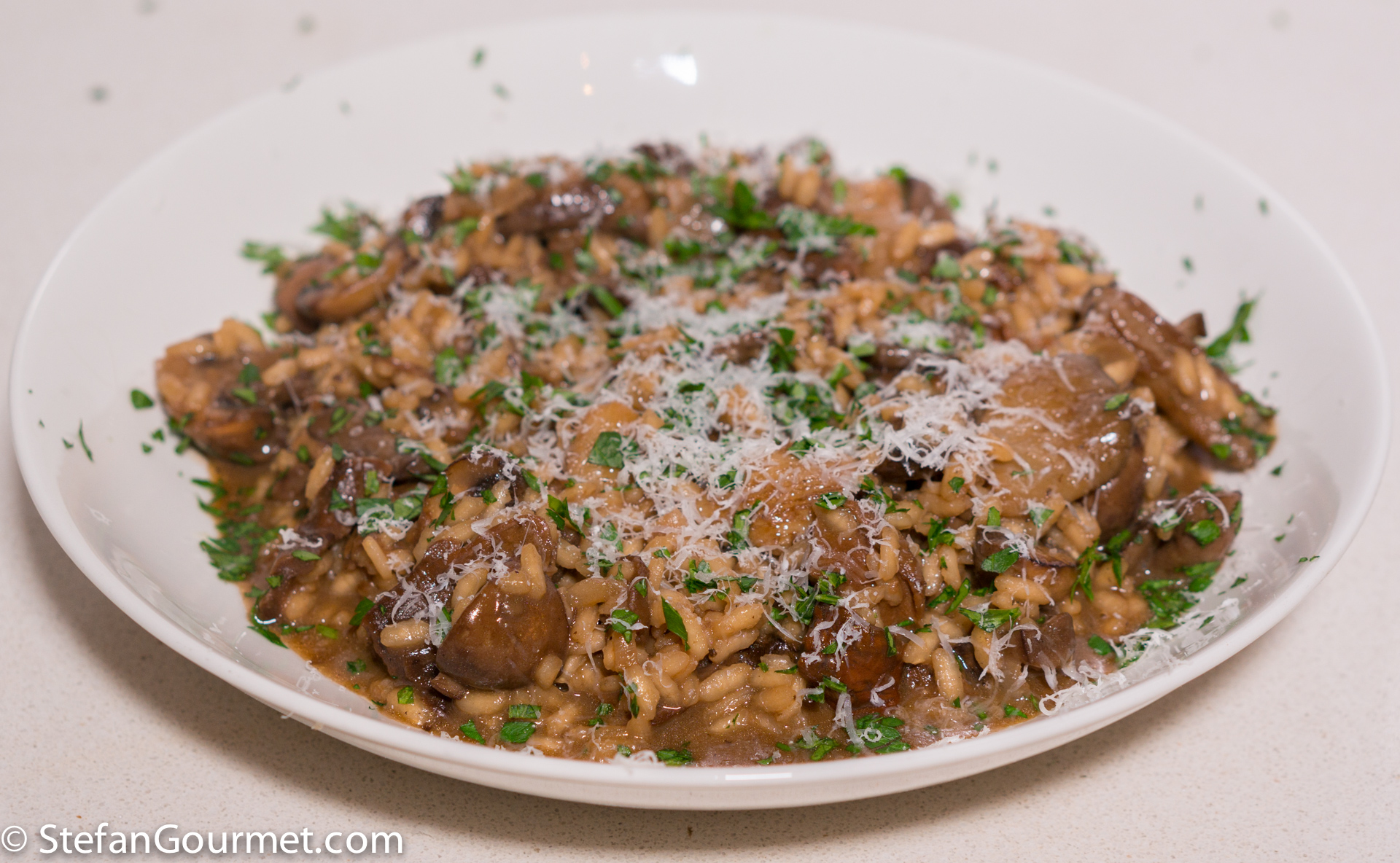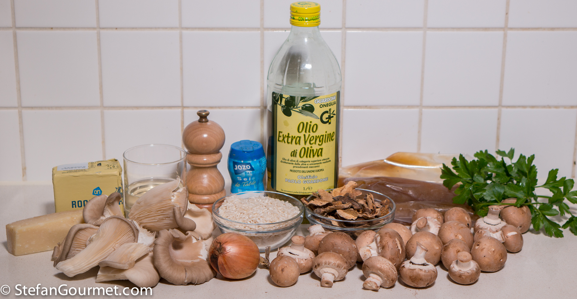 Mushroom risotto is one of the most common risotto recipes and it is very tasty because of the umami from the mushrooms and parmigiano. The advantage of using dried mushrooms for a part is that the soaking liquid is perfect for providing extra flavor to the risotto. You could use any mix of mushrooms for this risotto. Like any risotto, it takes about half an hour of stirring to make it, but it is worth it.