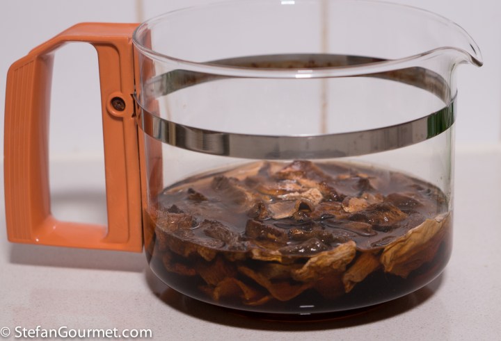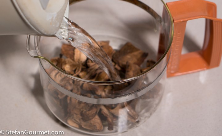 Put the dried porcini mushrooms in a bowl and cover with boiling water.