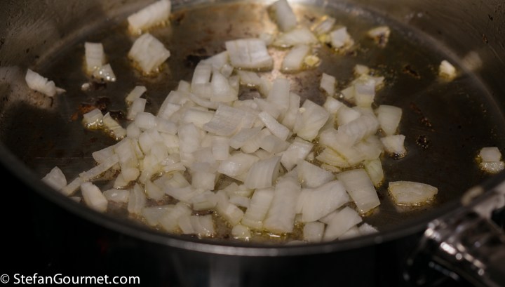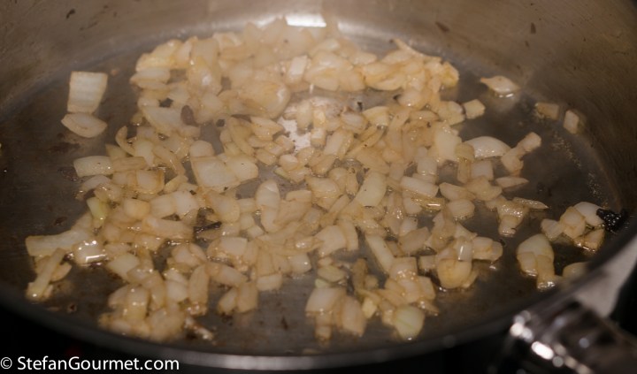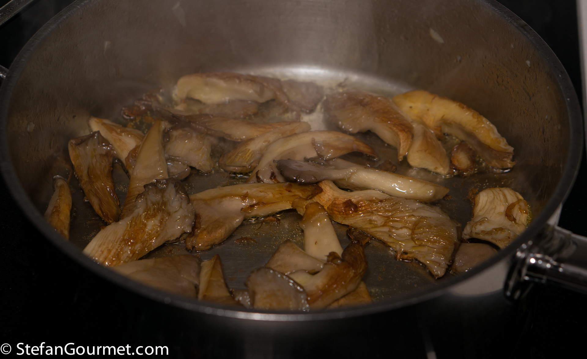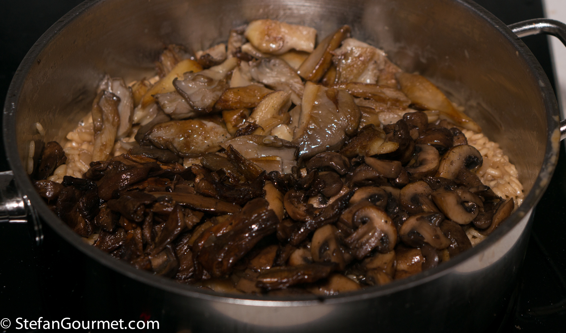 In the meantime, sauté the fresh mushrooms in olive oil over medium-high heat. Sauté each type separately because the cooking times may be different. Use the same pan you will be using for the risotto, so it should be wide and shallow, with a thick bottom so it holds heat well.