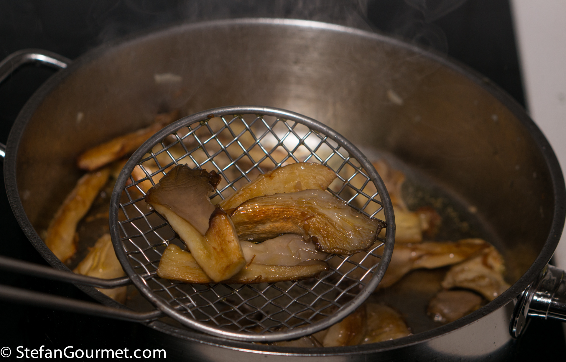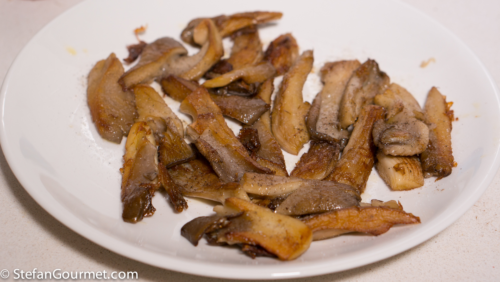 Put the cooked mushrooms on a plate and season with salt and freshly ground black pepper.
