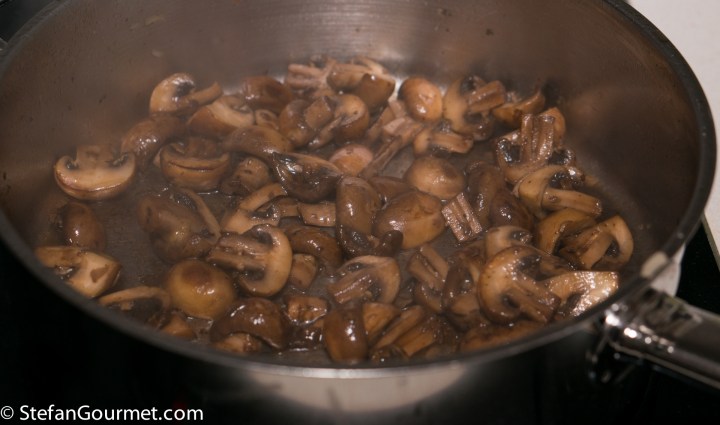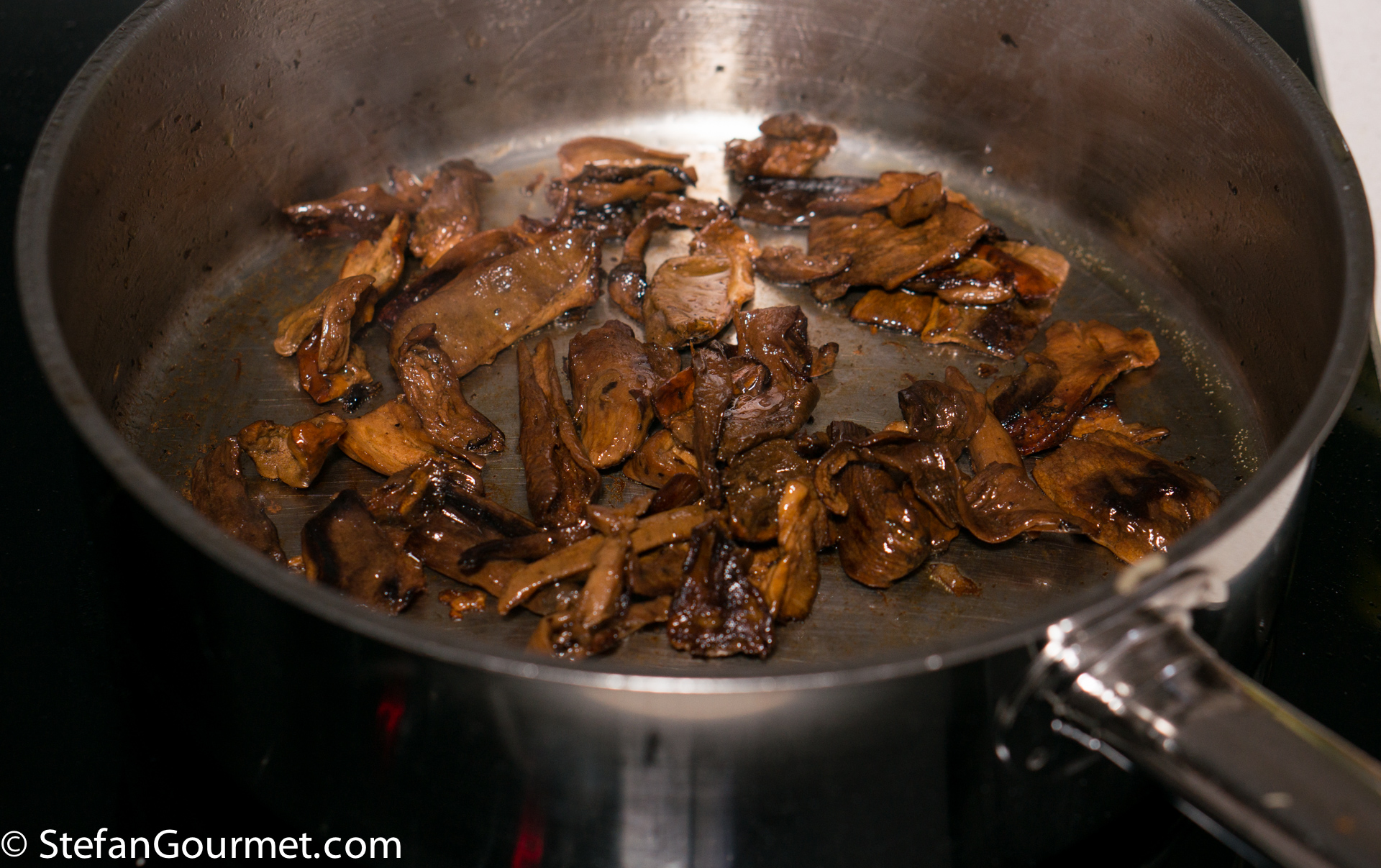 Briefly sauté the reconstituted porcini mushrooms in the same pan as the other mushrooms, and set them aside as well.