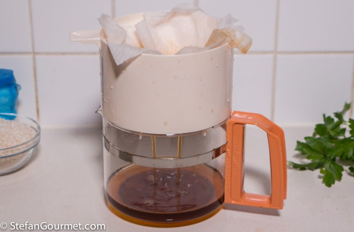 Meanwhile, strain the soaked mushrooms, reserving the liquid. Filter the liquid with kitchen paper to remove any sand.