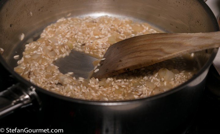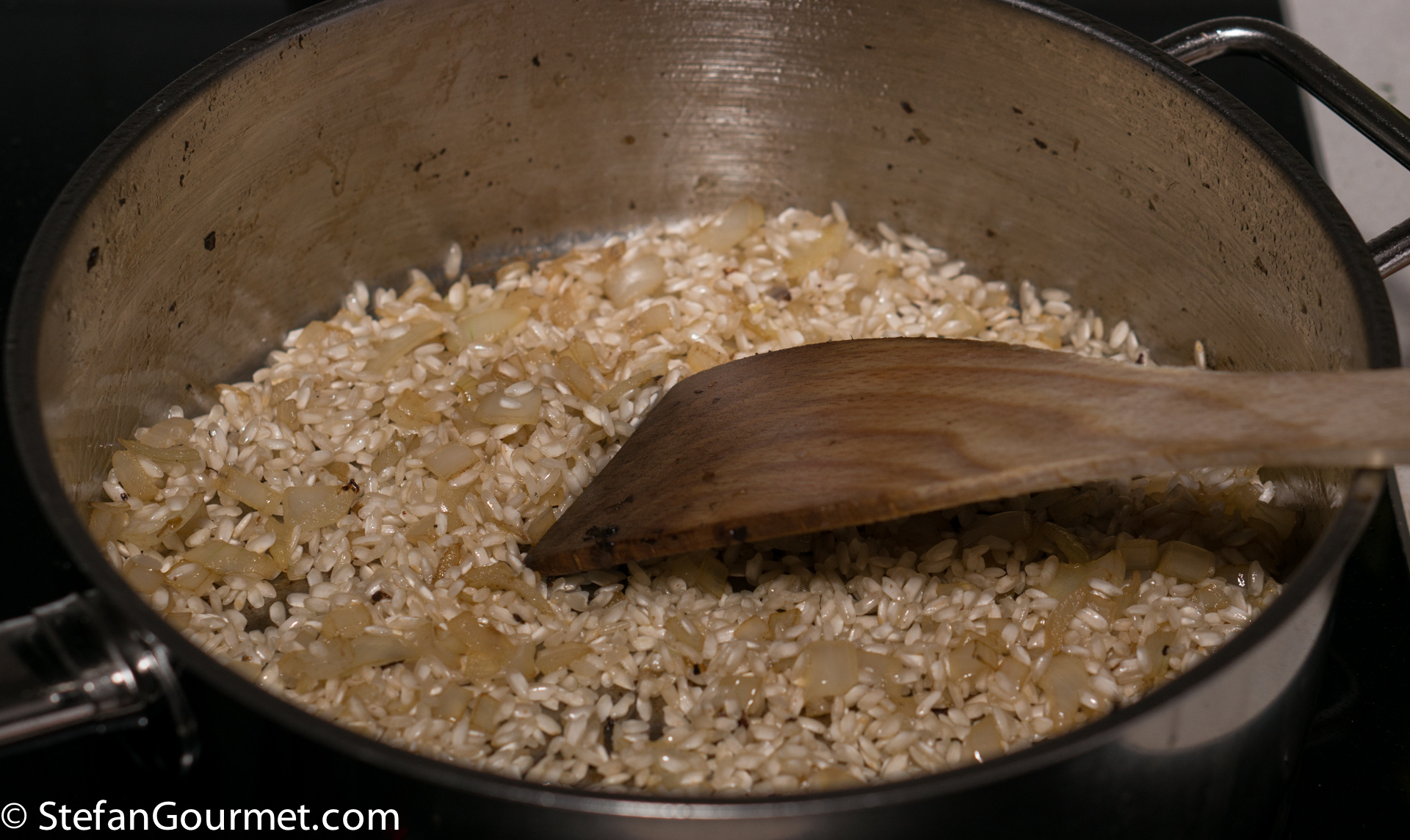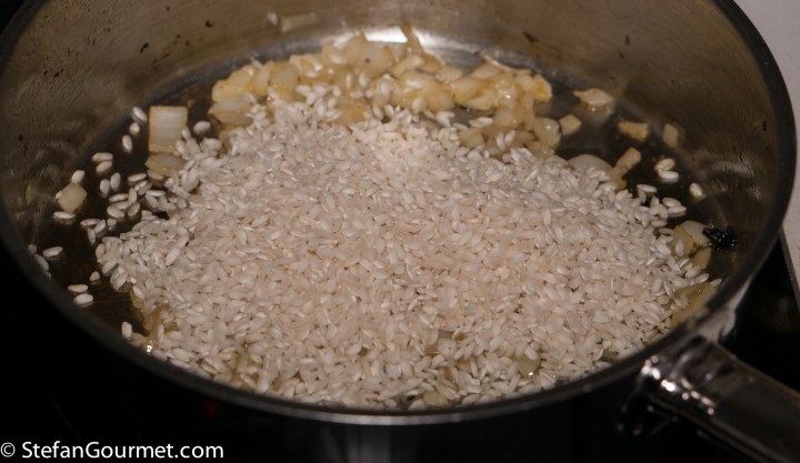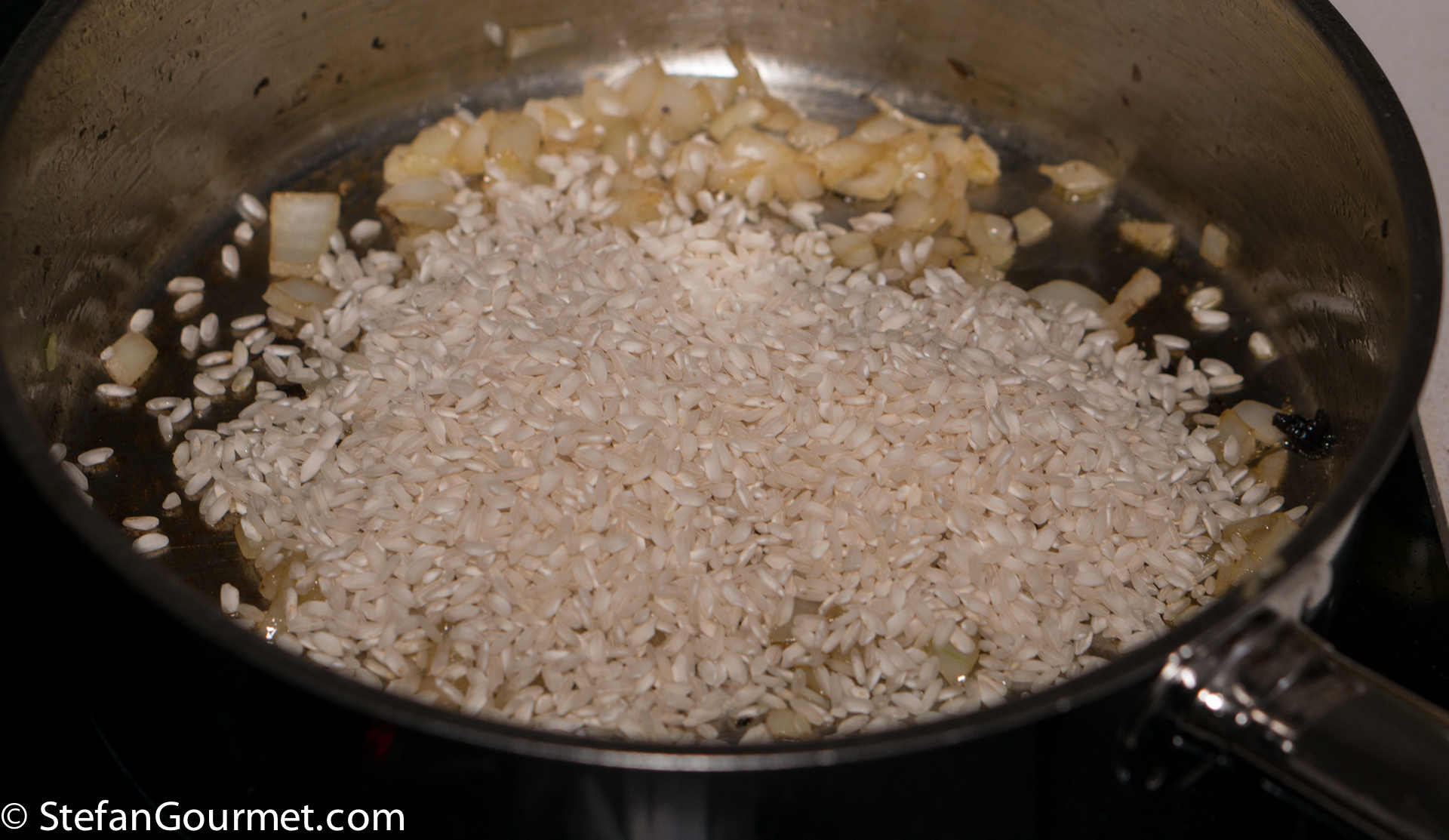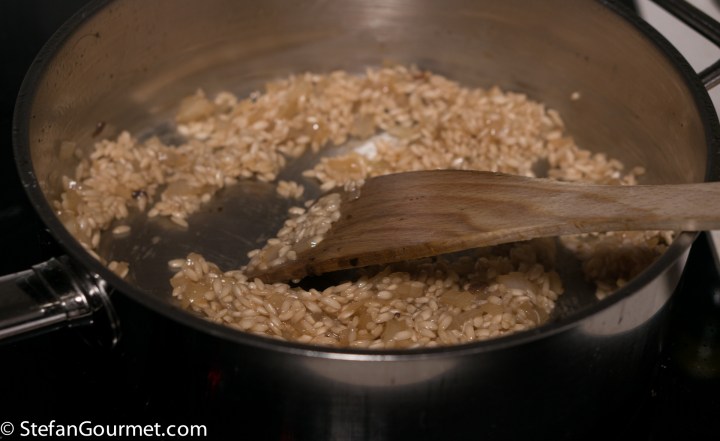 Toast the rice over medium heat for a couple of minutes, stirring. Increase the heat to medium-high.