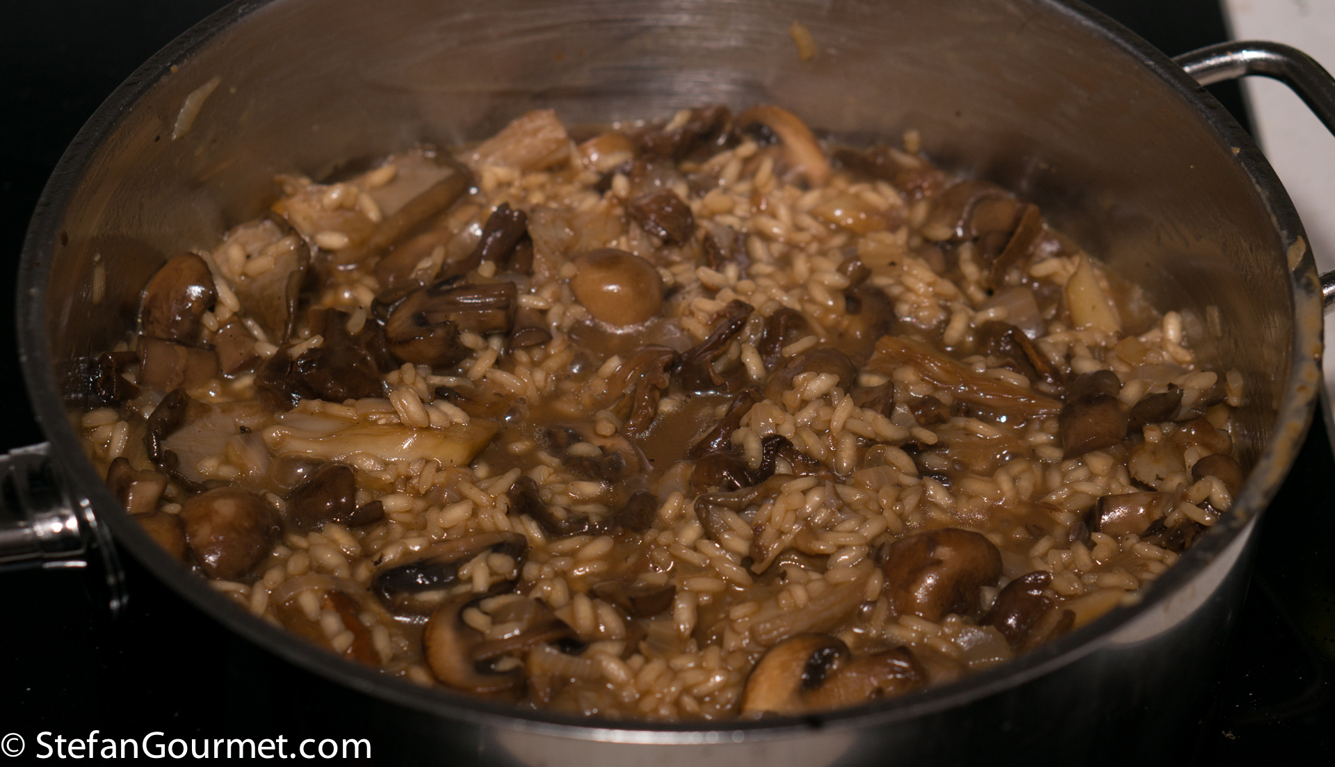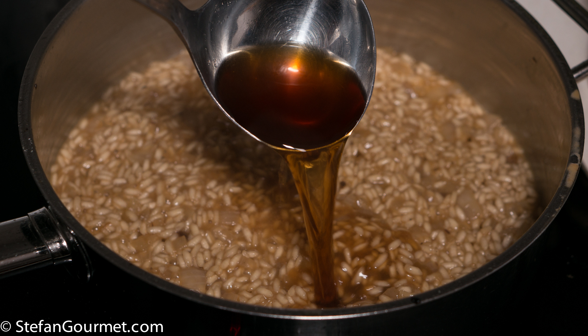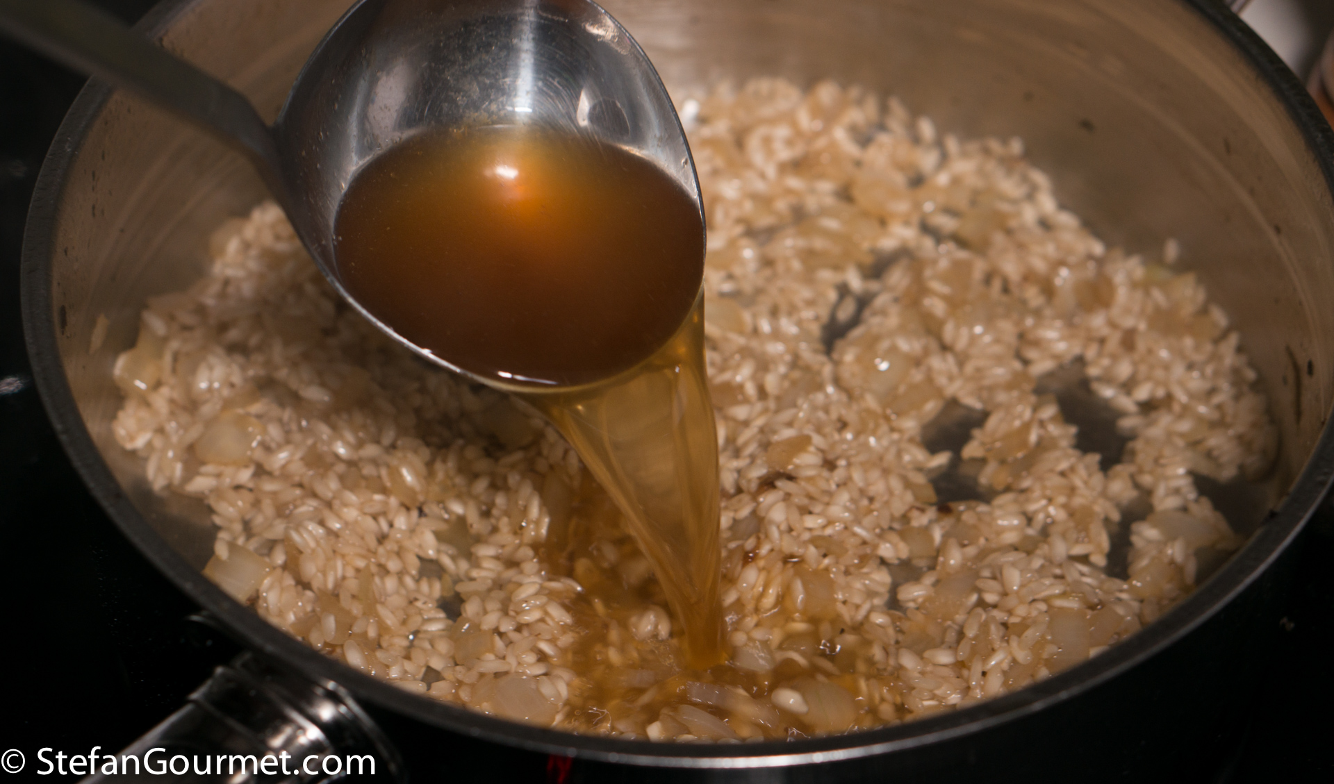 Now it is time to switch over from using stock to the mushroom soaking liquid, which you should also add hot.