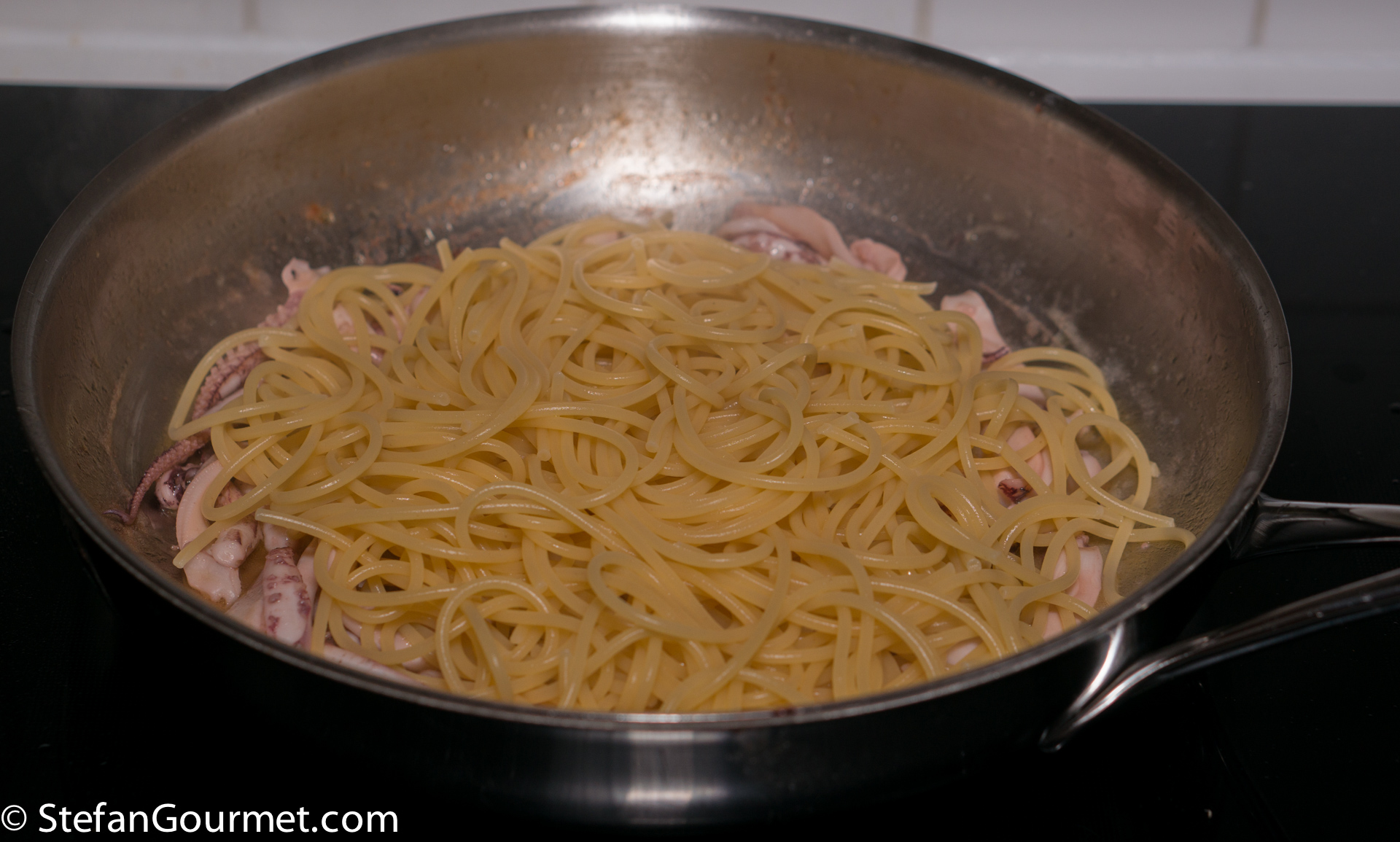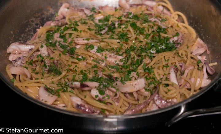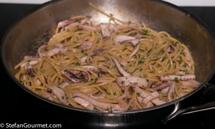As long as the squid has already been cleaned, this recipe definitely won’t take longer than is needed to cook the spaghetti. If dishes that are often made with tomatoes are made without them, in Italy that is called in bianco, the white version of the dish. The opposite can be called in rosso, but that is usually omitted.