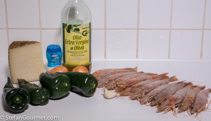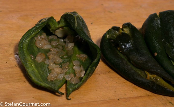This recipe is quite simple with a limited number of ingredients, but very tasty. The combination of textures and flavors works really well: spicy pepper, earthy shrimp, sweet soft onions, and cheesy cheese. If Poblano peppers are not available or you don’t like the spiciness (they are not that spicy actually), you could substitute them with bell peppers of any color and it would also be great. The only real work is skinning and seeding the peppers.