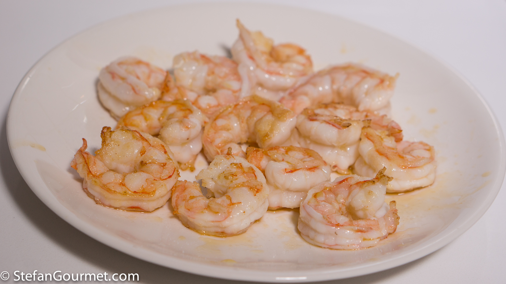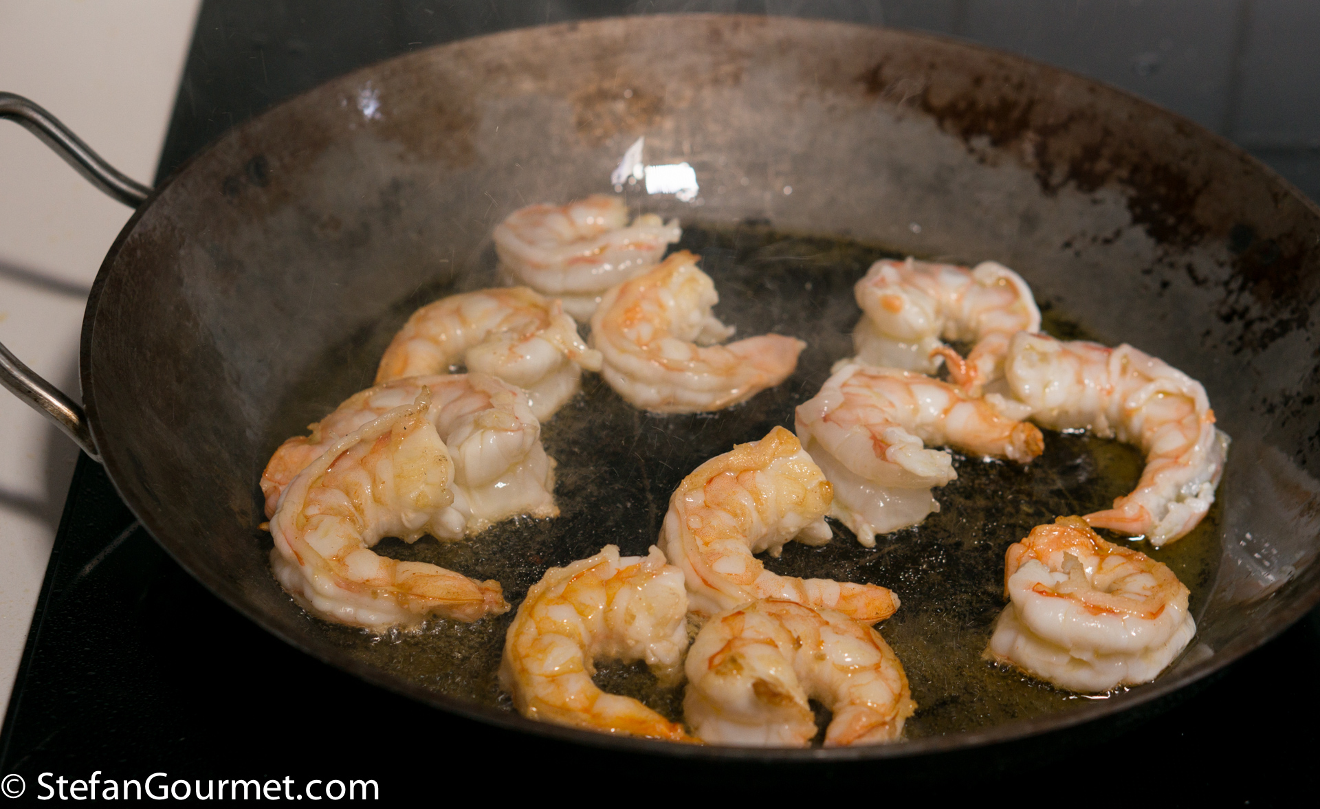 In the meantime, cook the shrimp over very high heat in the olive oil, not more than 1 minute per side. Browning the shrimp will give them more flavor, but they will be cooked through later.