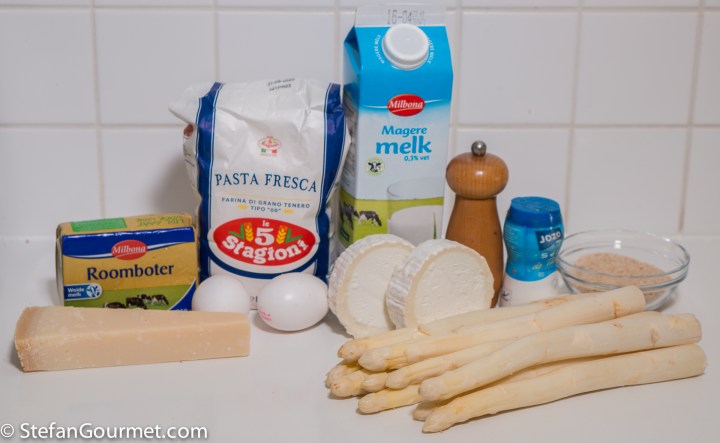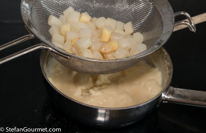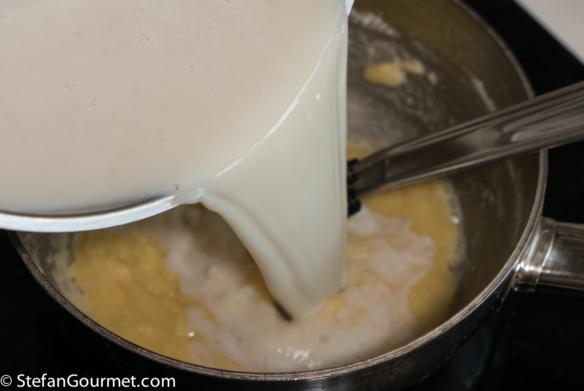white sauce from 250 ml (1 cup) milk, 250 ml (1 cup) reduced asparagus stock, 50 grams (1/3 cup) flour, and 50 grams (3 1/2 Tbsp) butter