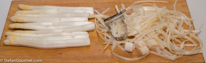 Peel the asparagus and trim 1 cm (1/2 inch) from the bottom. Save the trimmings and peels.